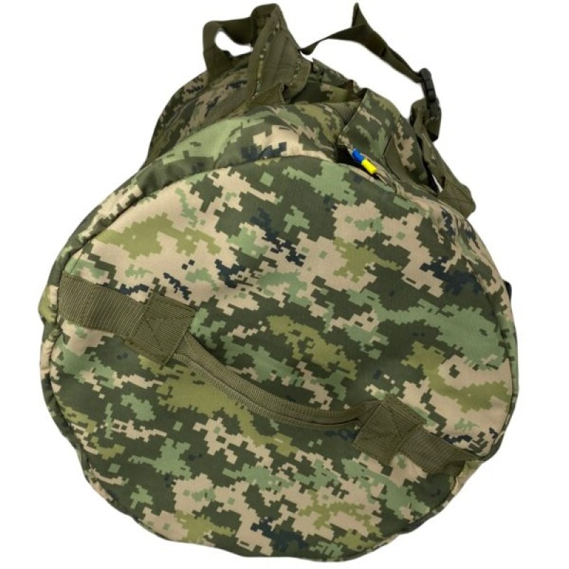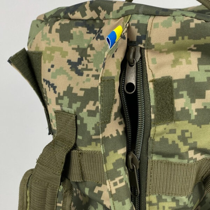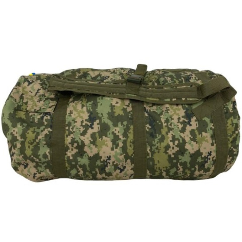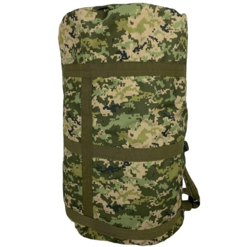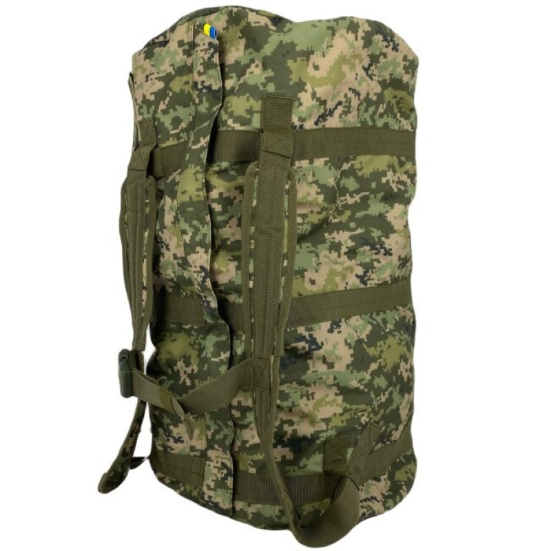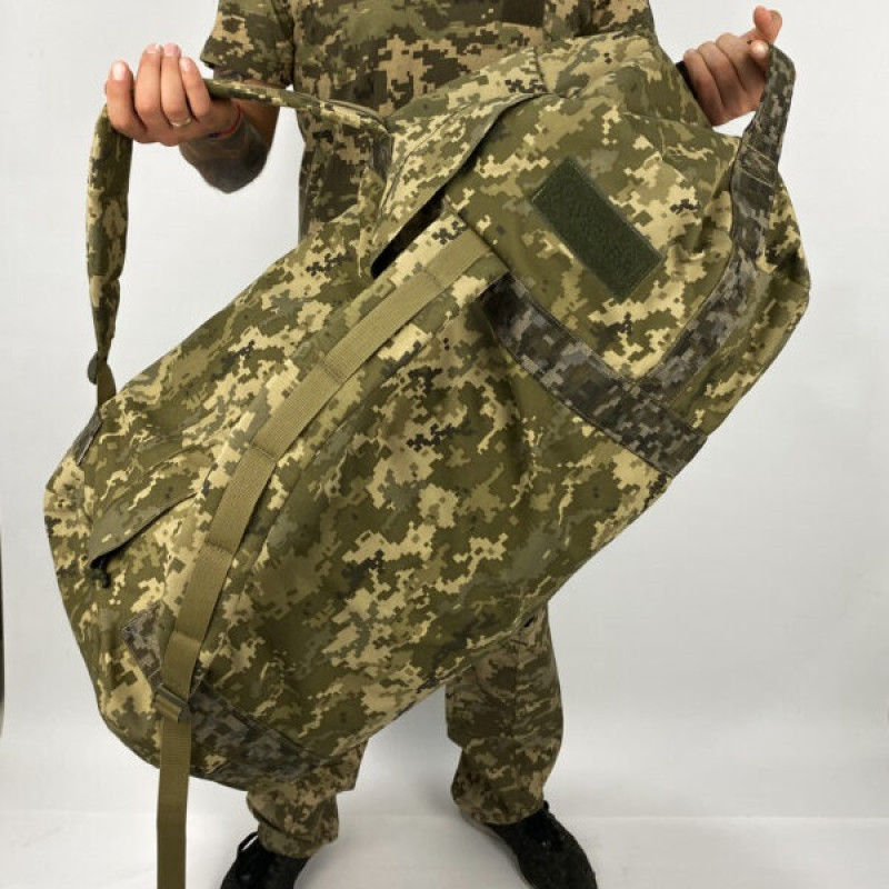 Сумка-баул 100л.,предназначенная для переноски личных вещей, военных, спортивных, туристических или охотничьих принадлежностей.Особенностью этой модели является то, что ее можно носить как сумку, и как рюкзак. Выполнена из прочной ткани пиксельной окраски. Материал устойчив к разрывам, различным видам деформаций, УФ-лучам и влаге.Несмотря на то, что в нем только одно основное отделение, сумка очень удобная, глубокая и вместительная. Основное отделение закрывается на двустороннюю застежку-молнию и имеет защитный клапан на липучках.С обеих сторон внутренней части сумки есть вместительные вшитые карманы с застежками-молниями. Они подойдут для хранения документов, мелких личных вещей или экипировки.Сумка имеет две широкие ручки, одновременно выступающие лямками, если носить ее как рюкзак. На лямки можно цеплять молле-совместимые элементы, а их длина регулируется ремнем с рамкой.Поверхность лямок изготовлена из той же ткани, что и сама сумка. Внутри они имеют мягкую подкладку, чтобы перенос рюкзака был более комфортным.Снаружи по бокам есть вспомогательные ручки, изготовленные из прочной ременной ленты. Для дополнительной прочности боковые части рюкзака также прошиты такими ременными лентами. Благодаря этому в сумке можно переносить даже самые тяжелые вещи.На сумке-рюкзаке предусмотрено специальное место для крепления шеврона.Характеристики:Ткань – Оксфорд 600D;Размер – 75х40х40 см;Цвет –пиксель;Вес – 600 г.