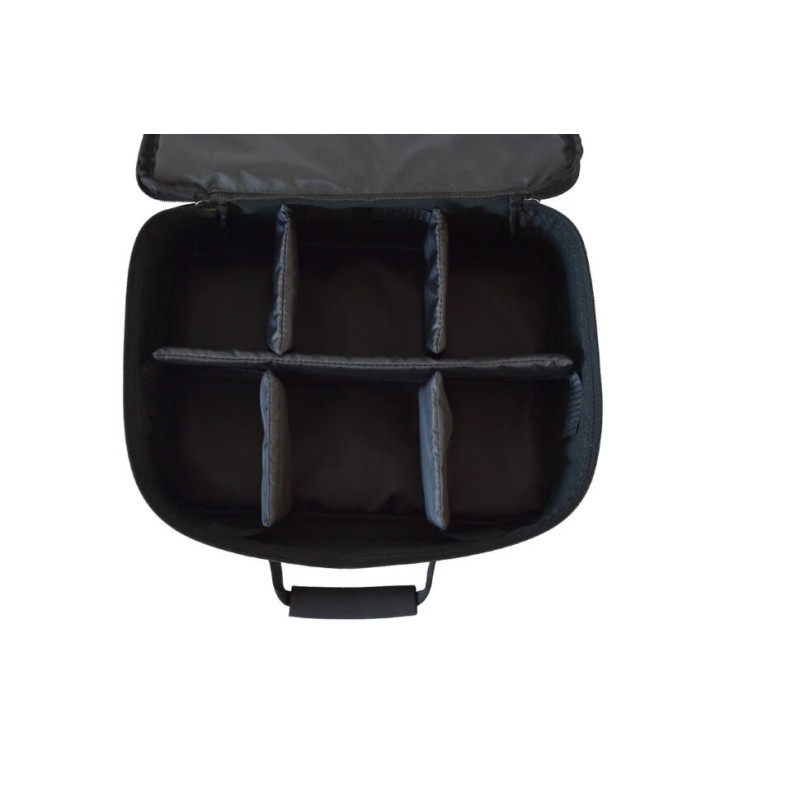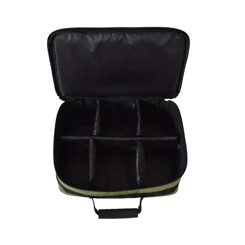 В середині сумка розділена на 6 відділень, які поділяються м'якими перегородками. Дані перегородки можна розміщувати за власним бажанням, що дозволяє використовувати сумку для котушок різних розмірів. Для пошиття сумки використовується тканина Оксфорд 600D і інша якісна фурнітура.