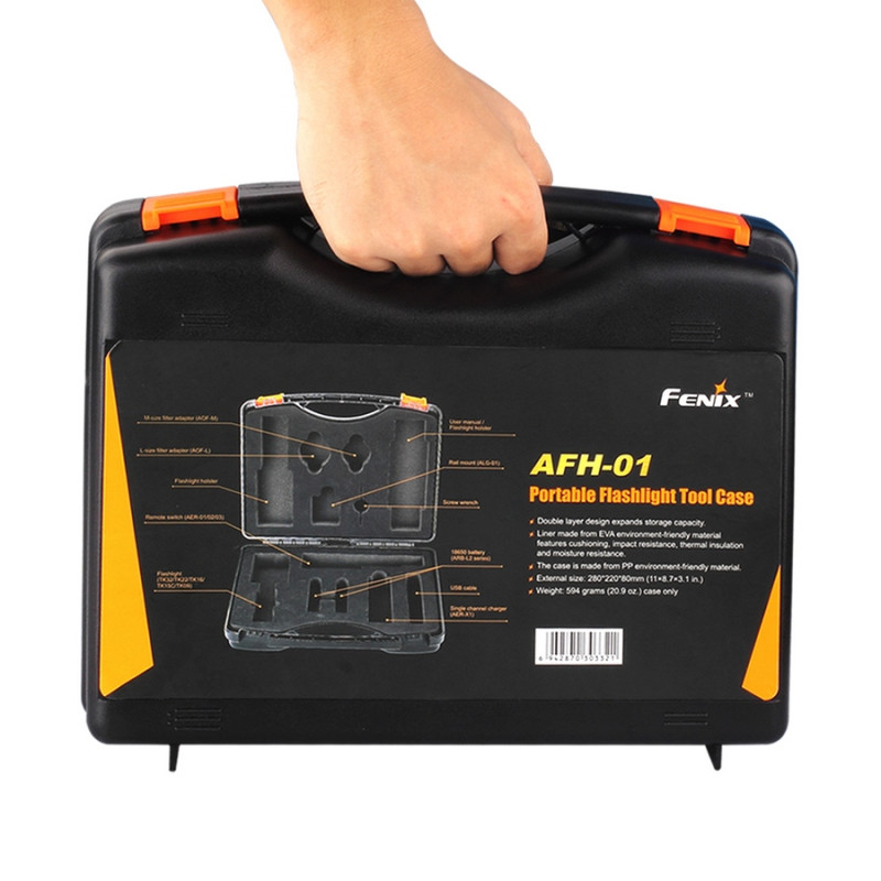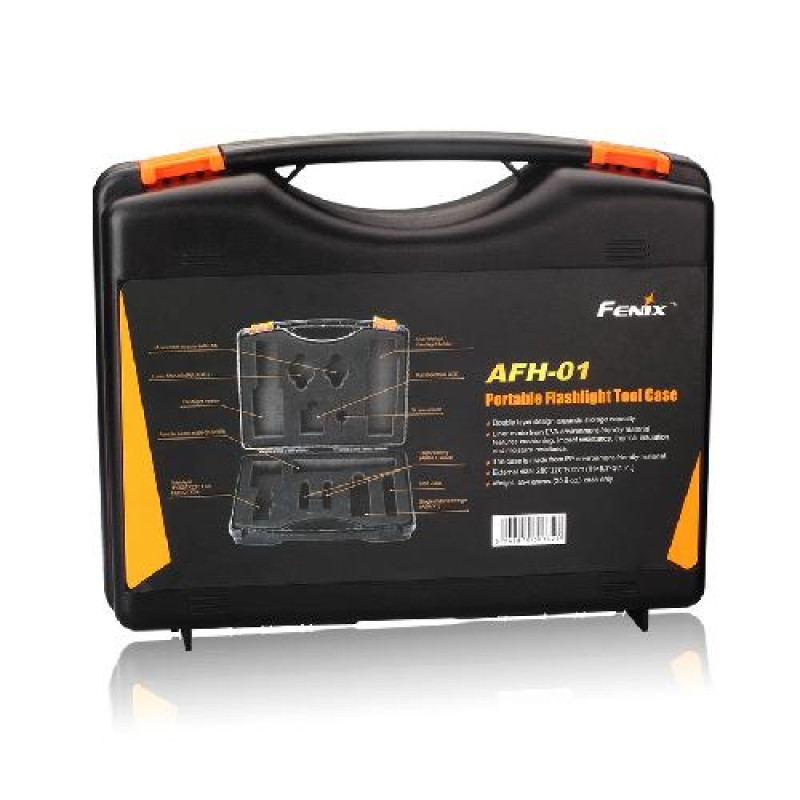 Ліхтарі і аксесуари до них, які випускає компанія Fenix, користуються великою популярністю серед мисливців та інших любителів активного відпочинку на природі. А тому виробники вирішили запропонувати також зручний варіант для комплексного зберігання всього набору спорядження — кейс Fenix AFH-01. Це досить компактний валізку з поліпропілену, який визнаний екологічно безпечним матеріалом. Його зовнішні розміри дорівнюють 28 × 22 × 8 див. Однак завдяки продуманому розміщенню всіх елементів як в нижній, так і у верхній кришці кейса, поміщається всередину досить таки багато компонентів. Для кожного предмета відведено спеціальне місце, яке дозволяє надійно зафіксувати його і вберегти від можливих пошкоджень в процесі транспортування. Передбачені спеціальні виїмки під ліхтар (моделі TK09, TK15C, TK16, TK22, TK32, PD35, PD35TAC, LD22 2015 і деякі інші), зарядний пристрій і кабель USB, два акумулятора 18650, два світлофільтру різного розміру, виносну тактичну кнопку, кріплення для зброї і ключ для його монтажу, а також під чохол для ліхтаря і відповідну інструкцію.