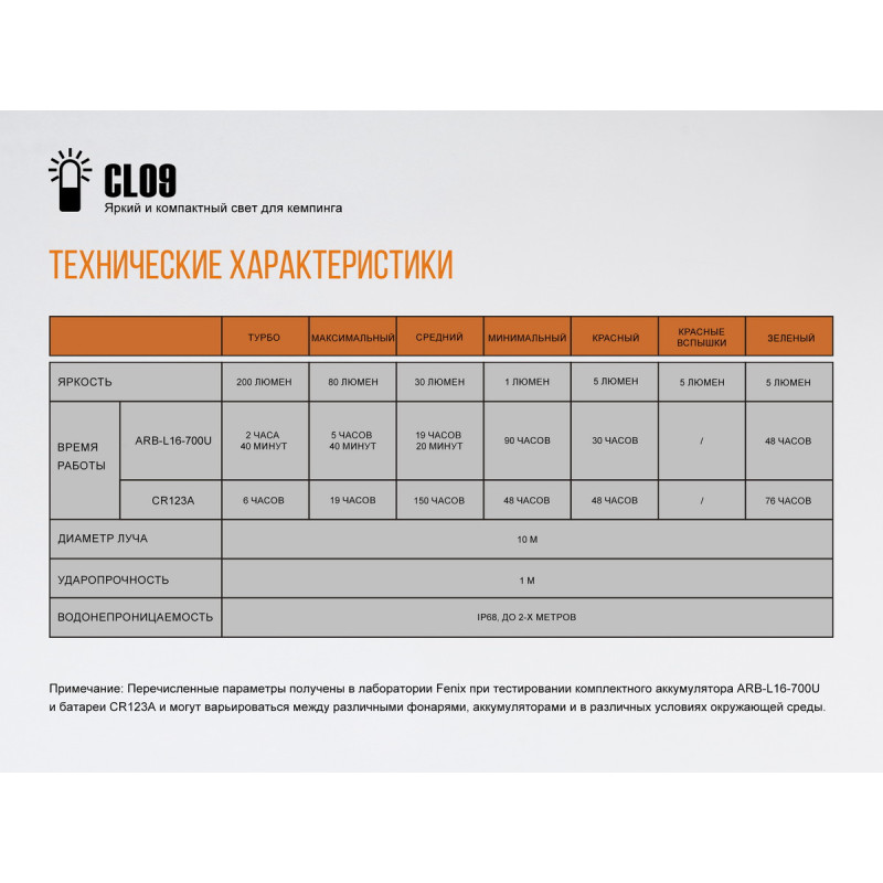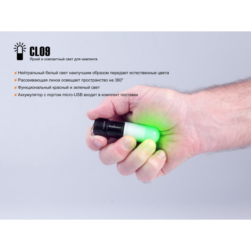 Модель Fenix CL09 призначена для всесезонного використання в кемпінгу. Цей ліхтар освітлення дає гарної якості, яке рівномірно розходиться відразу у всіх напрямках. Він обладнаний кількома діодами різного кольору: білого, червоного, зеленого. Всього ліхтар підтримує 7 режимів. Найяскравіший з них — це 200 люмен білого світла. Крім нього білий діод підтримує режими яскравості на 80, 30, 1 люмен, так що відповідне освітлення можливо вибрати в будь-якому випадку. Яскравість червоного і зеленого світла однакова і становить 5 люмен. Доступні режими постійного освітлення і миготливе червоне світло, який може використовуватися для подачі різних сигналів. У будь-якому з режимів світло розходиться відразу у всіх напрямках, оскільки ліхтар оснащений опуклою лінзою, що розсіює світло, зробленої з оптичного пластику. Діаметр території, яка освітлюється, становить 10 метрів.
