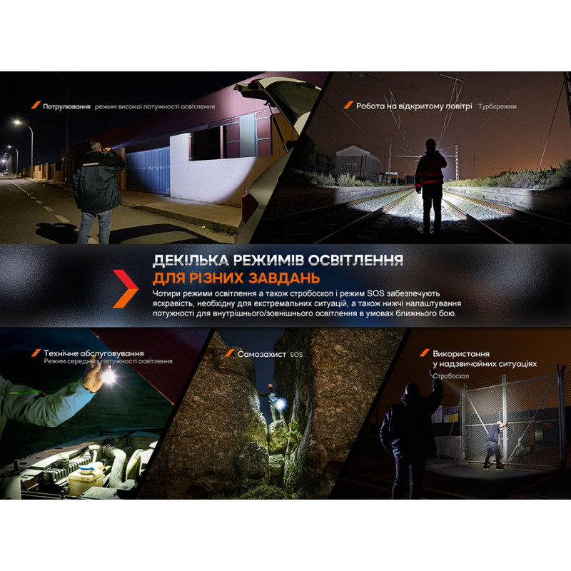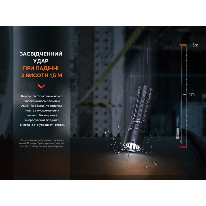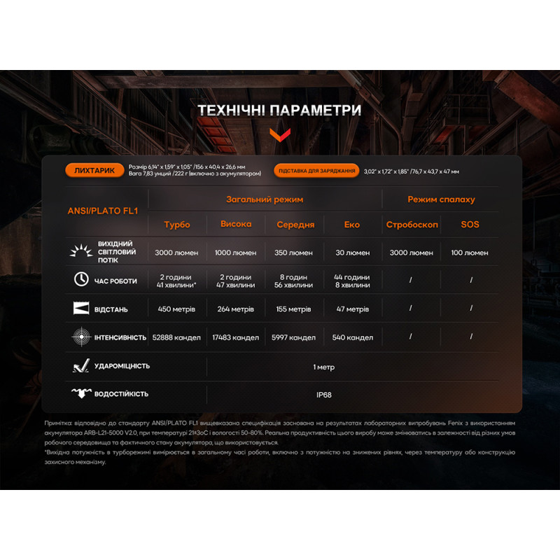 * Наведені показники часу роботи у 6 режимах були отримані в ході лабораторного тестування з використанням одного Li-ion акумулятора Fenix ARB-L21-5000 V2.0 при температурі повітря 21±3°C і вологості в межах 50%-80%. Тривалість роботи ліхтаря може відрізнятися залежно від умов навколишнього середовища та типу використовуваного елемента живлення.