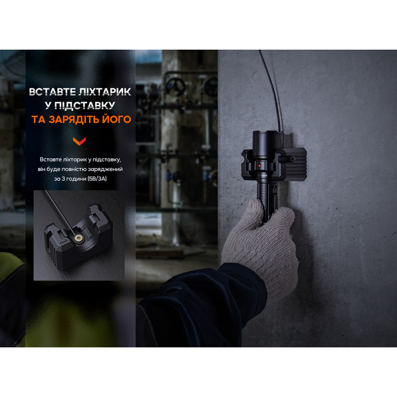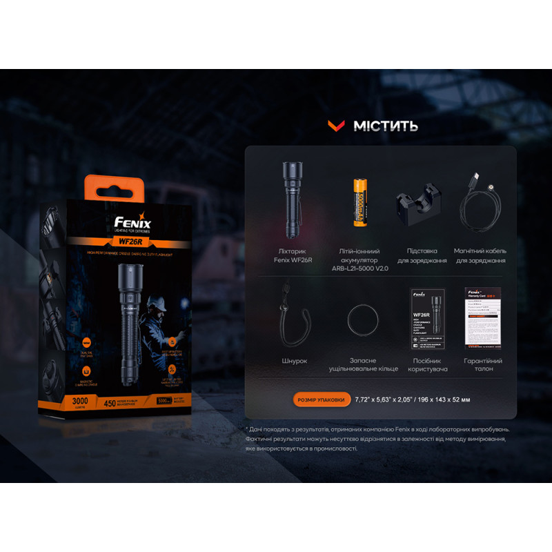 Ліхтар Fenix WF26R, акумулятор ARB-L21-5000 V2.0, підставка з магнітним кабелем для зарядки, запасне ущільнювальне кільце, темляк, посібник користувача, гарантійний талон.