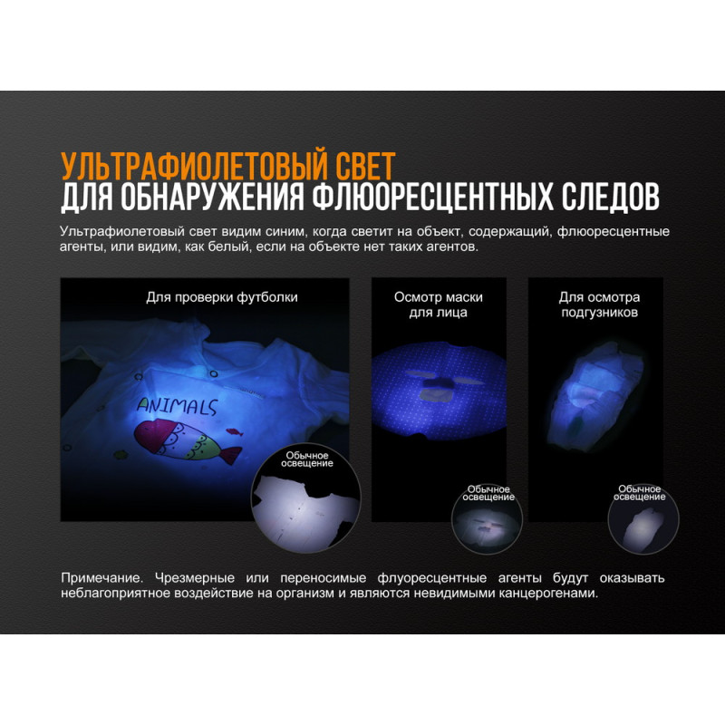 - UV Light: потужність променя становить 200 мВ, час роботи ліхтаря з батарейкою не перевищує 4 годин, а з акумулятором рівно 3 години.