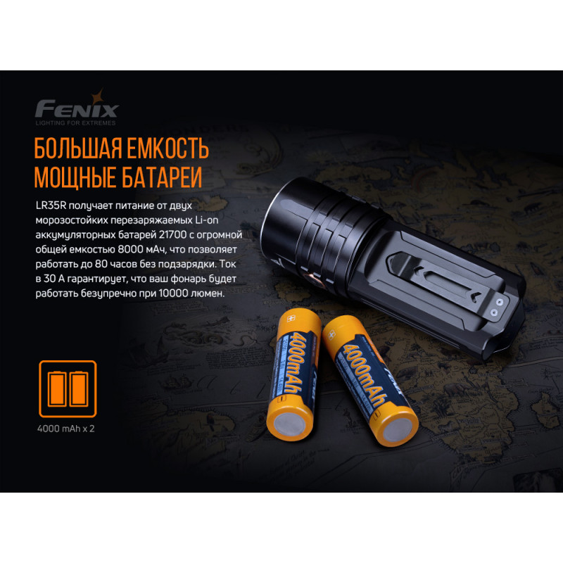 Модель Fenix LR35R являє собою єдиний у своєму роді ліхтар з найбільшою яскравістю 10000 люменів в такому маленькому корпусі. Пристрій позиціонується, як пошуковий варіант, і його промінь світла долає дистанцію п'ятсот метрів. В наборі разом з ліхтарем йдуть дві літій-іонні батареї ємністю 4000 маг кожна форм-фактора 21700. Вихідний струм – 30 ампер. Батареї можна заряджати за допомогою порту USB Type-C. Кут прожектора в 90 градусів сприяє дослідницьких, пошукових і рятувальних видами діяльності. Індикатор ступеня зарядженості покаже рівень заряду батарей.