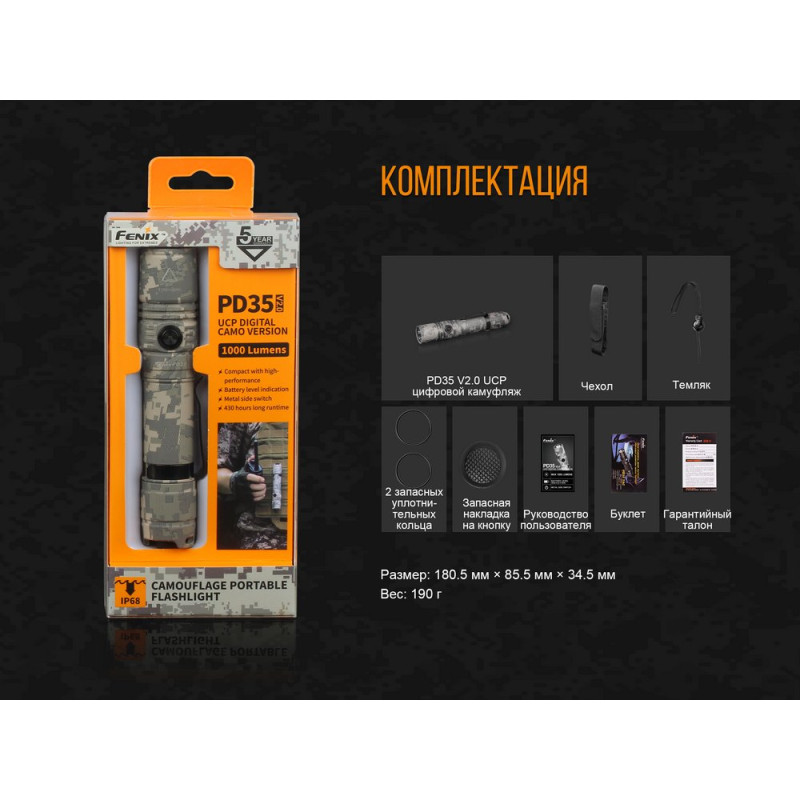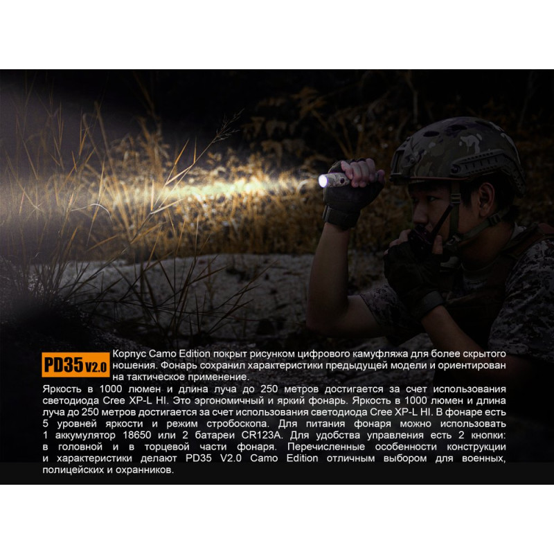 Опис ліхтарі Fenix PD35 V2.0 UCP Digital Camo Edition: