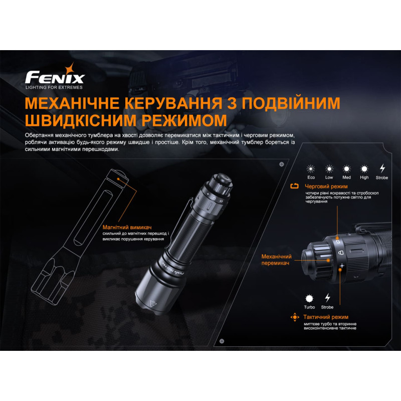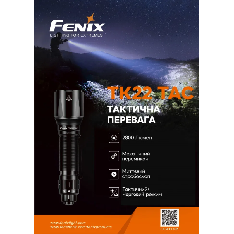 Ліхтар моделі Fenix TK22TAC є військовим приладом. Розроблений з урахуванням потреб тактичного та чергового освітлення, TK22 TAC має тактичні та чергові режими.