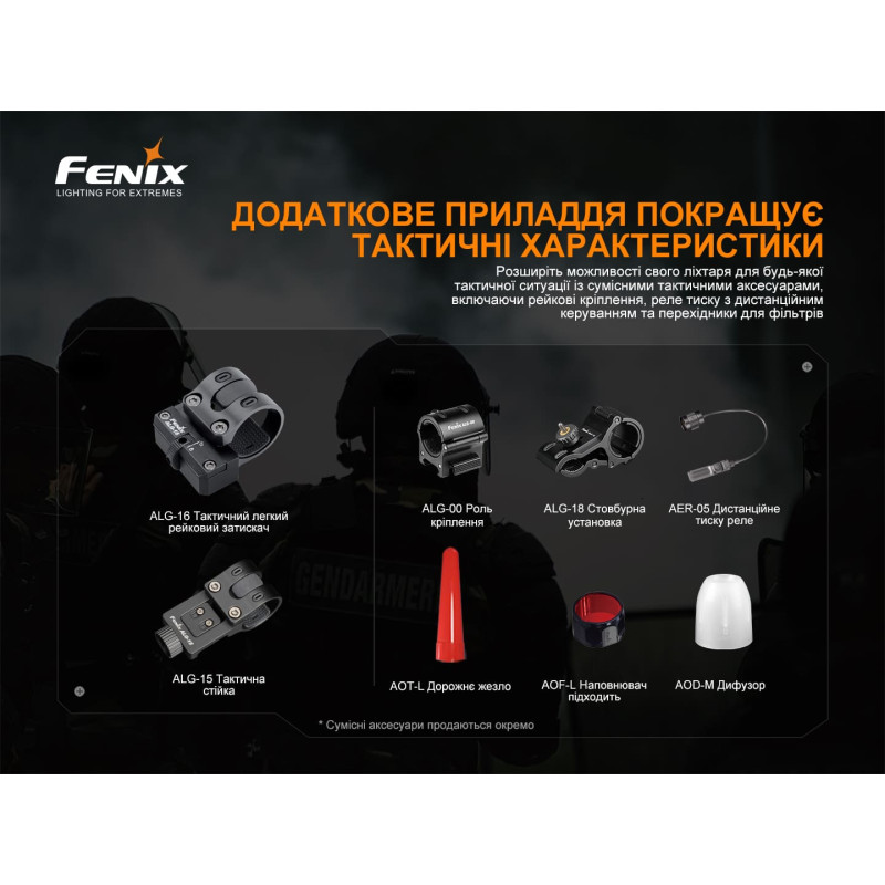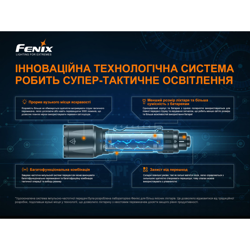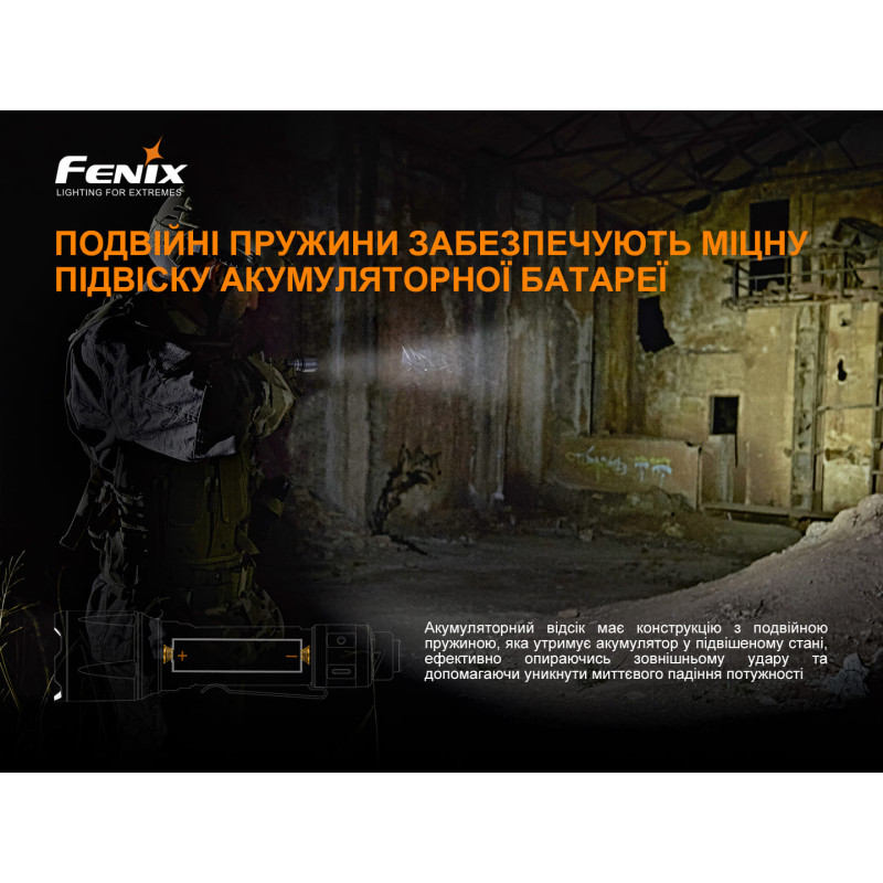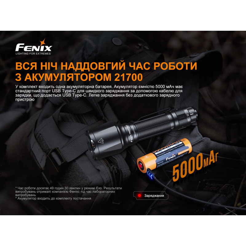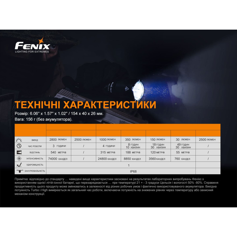 Звертаємо вашу увагу на те, що такі параметри роботи моделі отримані в результаті лабораторних випробувань. Для цього застосовували акумулятор Fenix ARB-L21-5000U при температурі 21+-3 градуси Цельсія та вологості 50-80 відсотків. Фактичні показники свічення ліхтаря можуть відрізнятися від наведених, залежно від елементів живлення та факторів зовнішнього середовища.