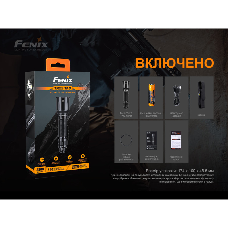 Комплектація: модель ліхтаря Fenix TK22TAC, акумулятор Fenix ARB-L21-5000U літій-іонний, кабель для заряджання USB Type-C, чохол, запасне кільце ущільнювача, інструкція, талон гарантії.
