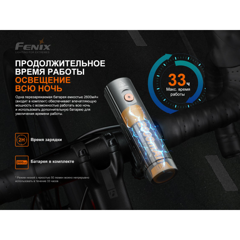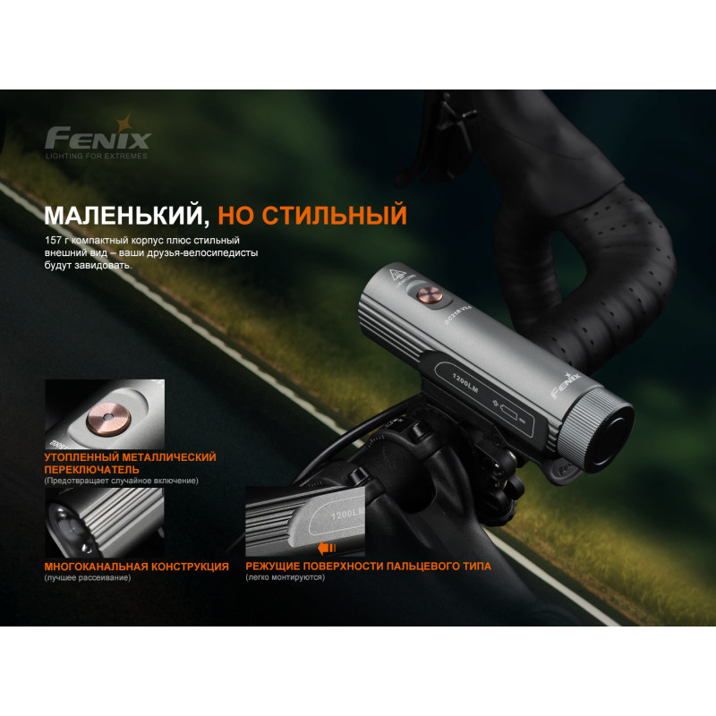 Модель Fenix BC21R V3.0 — це професійний велосипедний ліхтар для гірського та шосейного велоспорту, що підходить для інтенсивних заїздів на довгі дистанції. Яскравість світла досягає 1200 люменів і його можна побачити на дистанції 142 метри. Ліхтар перезаряджається через USB Type-C і живиться від батареї, що додається, ємністю 18650/2600 мАг.