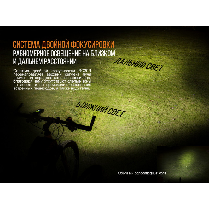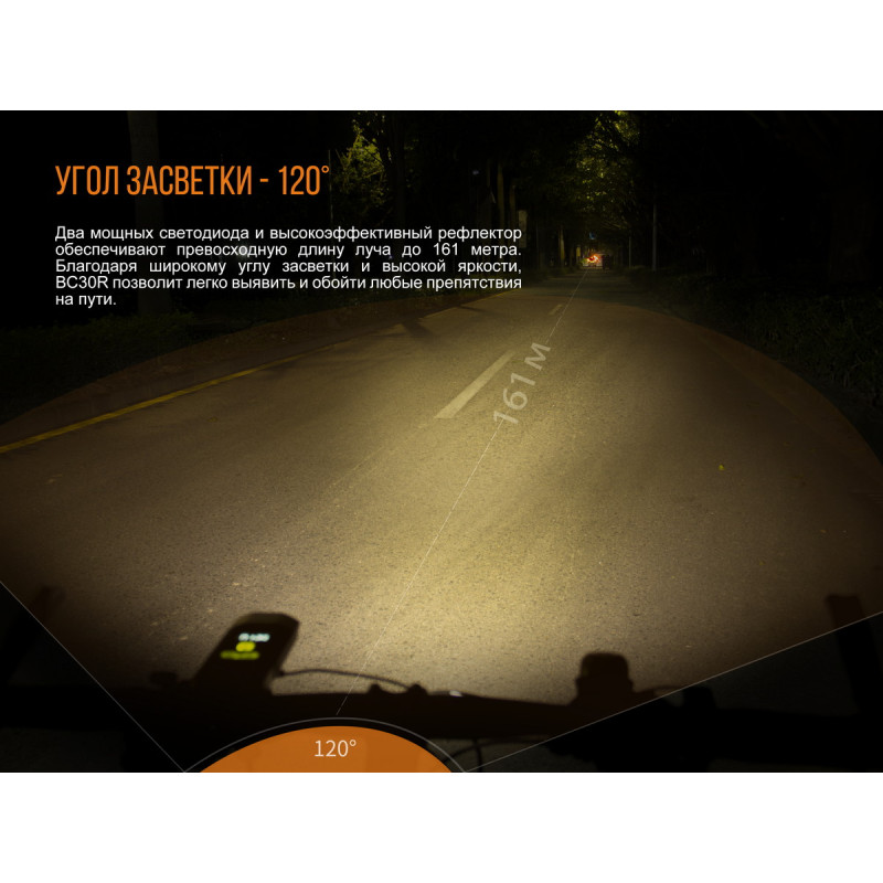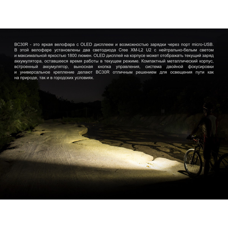 Модель Fenix BC30R — це сучасна модель велофари, яка підійде практично для будь-якого велосипеда. Завдяки наявності універсального кріплення, вона підійде для рулів, діаметр яких знаходиться в діапазоні 22-35 мм. Даний ліхтар використовують для освітлення діоди бренду Cree, відомі своєю високою довговічністю. Конкретно для цієї велофари обрані XM-L2 U2. Вони дають біле світло, наближеного до сонячного нейтрального відтінку, який краще всього передає об'єм предметів і дозволяє найбільш точно оцінити відстань до них. Кількість режимів, які ліхтар підтримує — 6. Один з режимів — миготливий і може використовуватися в сутінках або ж під час густого туману, щоб велосипедист був краще помітний на дорозі.