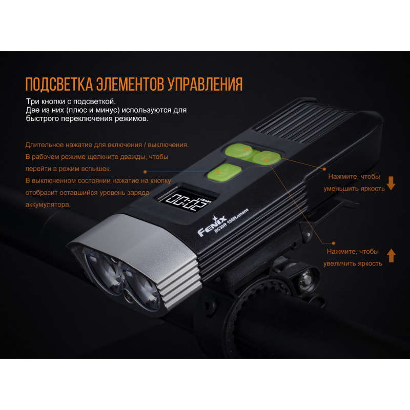 Управління велофарой Fenix BC30R реалізовано максимально логічно. Одна кнопка вмикає і вимикає ліхтар, забезпечує доступ до блимати режиму і відомостями про індикації заряду. Дві що залишилися працюють як перемикачі яскравості: одна — по зростаючій, а друга — за зменшенням.