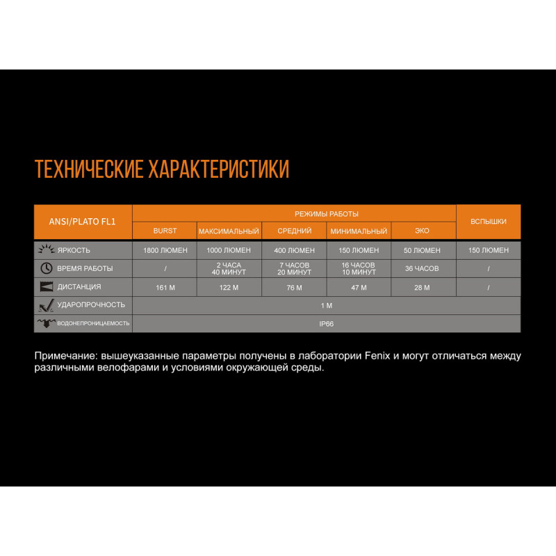 Найяскравіший режим — це Burst (1800 люмен). Радіус освітлення при його включенні становить 161 м. Наступний по яскравості — режим High (1000 люмен). Він дозволяє висвітлювати до 122 метрів простору, а заряду акумулятора вистачить для підтримки даного режиму протягом 2 з 40 хв. Середній режим яскравості — Med. Він дає 400 люмен світла з радіусом променя 76 метрів і тривалістю роботи — 7 год 20 хв. Режим Low дає 150 люмен світла, а дальність освітлення в ньому становить 47 метрів. Ліхтар зможе підтримувати цей режим 16 год 10 хв. Нарешті, самий економний по яскравості режим — це Eco. Він дає 50 люмен світла з радіусом засвічення 28 метрів. Період роботи ліхтаря від одного заряду становить 36 годин.