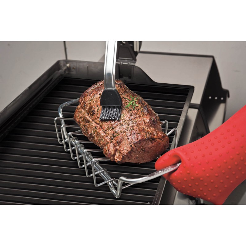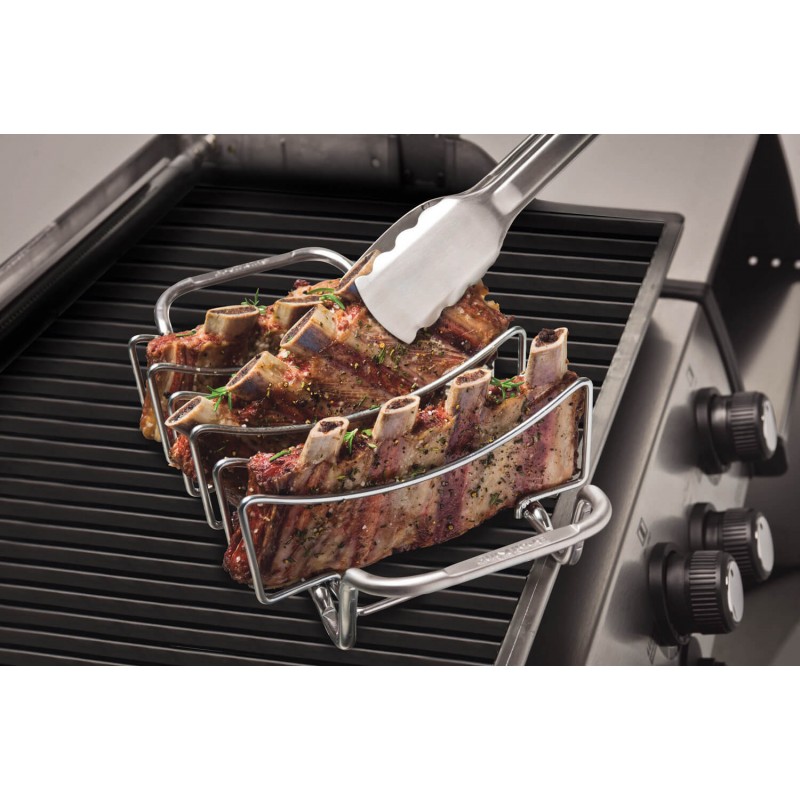 З нею Ви зможете одночасно запекти до 5 ребер або 1 великий шматок м'яса, а зручні ручки дозволять швидко і легко переміщати стійку всередині гриля. Матеріал: Високоякісна прутовая нержавіюча сталь Товщина металу: 10мм Кількість секцій: 5