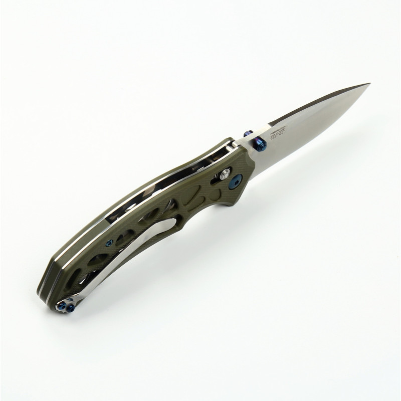 Клинок цього ножа виконаний у формі Drop-point і має прямий заточуванням ріжучої кромки, завдяки чому він чудово підходить для виконання рівного і акуратного реза, що напевно буде корисно при роботі з продуктами, тканиною, картоном, пластиком та іншими матеріалами. Для його виготовлення використовується сталь з маркуванням 440С, загартована до рівня ~58 HRC, завдяки чому лезо вийшло міцним, довговічним і стійким до корозії. У відкритому положенні воно фіксується з допомогою замка Axis-lock.