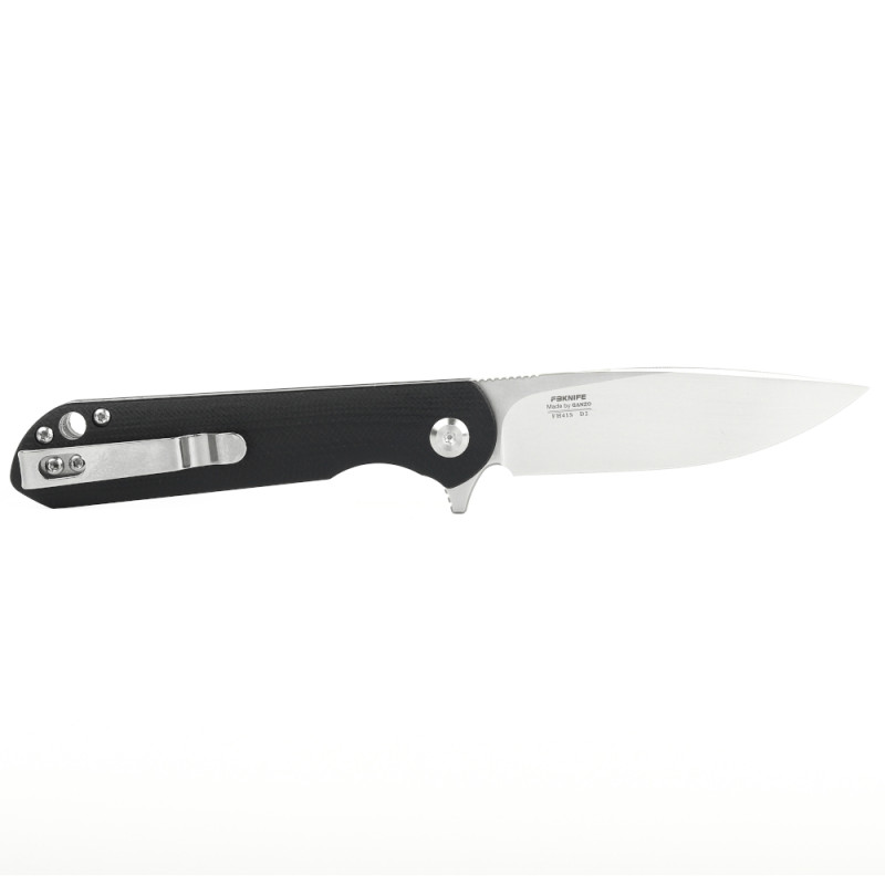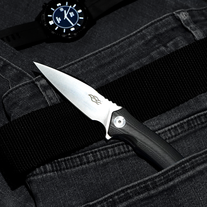 Лезо Firebird FH41S-BK виготовлено з інструментальної сталі D2. Даний сплав-гарант ефективності і довгого терміну служби виробу, завдяки збалансованому складу. Вміст хрому в сталі коливається в межах 11-13%, що робить матеріал стійким до появи корозійних плям при попаданні на клинок води або впливі агресивних середовищ. Головна перевага даної сталі-тривале утримання заточування навіть при інтенсивних навантаженнях, включаючи роботу з такими щільними матеріалами, як деревина. При цьому клинок не деформується і не вимагає багато часу і сил для заточування — для цього підійде звичайний точильний камінь. Для відкриття ножа досить натиснути пальцем на сталевий плавник, після чого клинок намертво фіксується для подальшого безпечного використання.