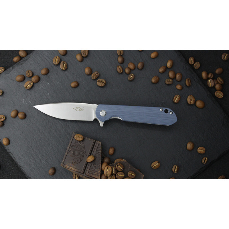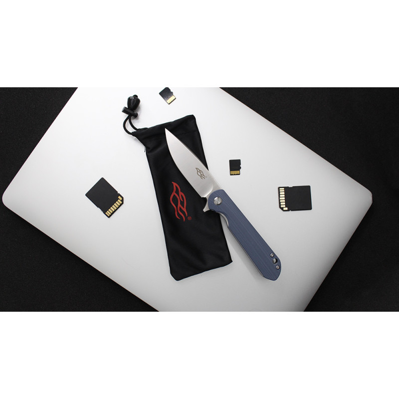 Лезо Firebird FH41S-GY виготовлено з інструментальної стали D2. Даний сплав-гарант ефективності і довгого терміну служби виробу, завдяки збалансованому складу. Вміст хрому в сталі коливається в межах 11-13%, що робить матеріал стійким до появи корозійних плям при попаданні на клинок води або впливі агресивних середовищ. Головна перевага даної сталі-тривале утримання заточування навіть при інтенсивних навантаженнях, включаючи роботу з такими щільними матеріалами, як деревина. При цьому клинок не деформується і не вимагає багато часу і сил для заточування — для цього підійде звичайний точильний камінь. Для відкриття ножа досить натиснути пальцем на сталевий плавник, після чого клинок намертво фіксується для подальшого безпечного використання.