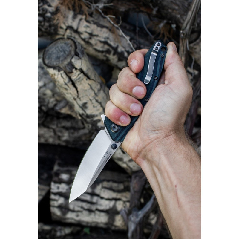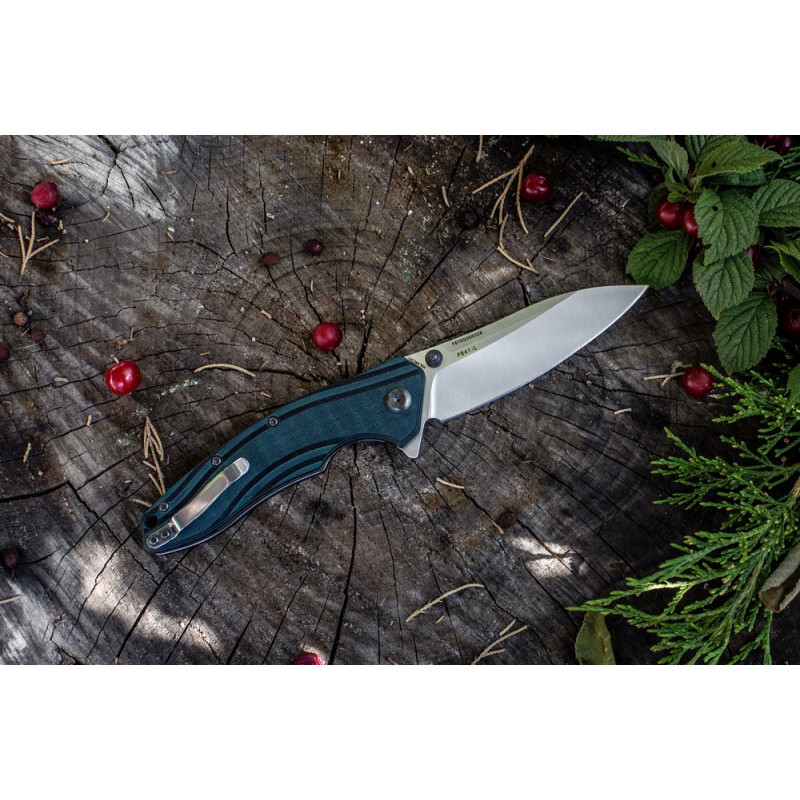 Рукоять ножа має анатомічні форми і завдяки тому, що складається з металевих лайнерів і накладок з G10, володіє відмінною міцністю і стійкістю до несприятливих умов. Фактурний візерунок на поверхні накладок дозволяє впевнено утримувати ніж будь хватом.