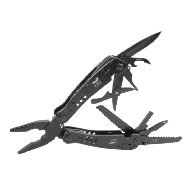 Количество функций плоскогубці, кусачки, маленька викрутка плоска, ніж, серрейтор, консервний ніж, відкривачка для пляшок, для зняття ізоляції, пила, захоплення для гайок і циліндрів, ножиці, шило, тримач біт, 12 змінних насадок в комплекті