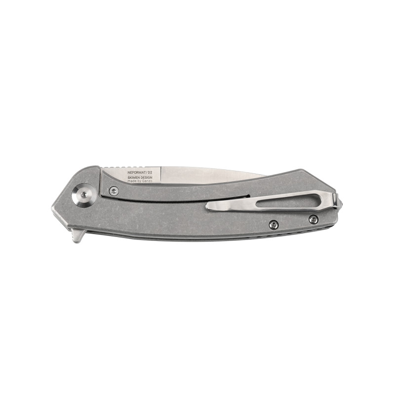 В основі ножа – надміцна, зносостійка сталь марки D2. Захищений від корозії металевий сплав демонструє високі показники твердості. Значення твердості у ножа – близько 60 одиниць за шкалою Роквелла, що дуже добре для даного виду продукції. Тип заточення – прямий. Довжина клинка становить вісім з половиною сантиметрів, товщина – три з половиною міліметри. Модель складна, лезо витягується за допомогою зручного замку Flipper. Skimen надійним чином захищений від випадкового відкриття або закриття. Він безпечний у застосуванні, і має просту конструкцію. Загальна довжина виробу всього 20,5 сантиметри. Такі компактні габарити дають перевагу ножу для застосування кожен день. Його можна легко покласти в сумку або кишеню, і застосовувати за необхідності, модель завжди під рукою.