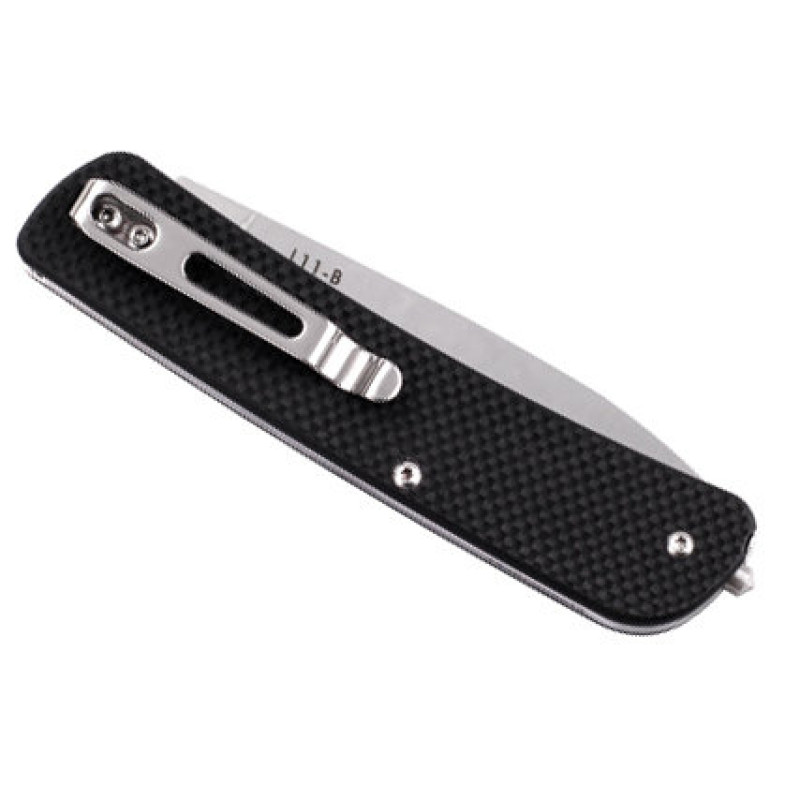 Накладки на рукоять виготовлені з зносостійкого полімерного матеріалу G10, який славиться своєю міцністю і довговічністю. А завдяки фактурної поверхні і ергономічною формою рукояті, модель L11 зручно утримувати практично будь хватом. В асортименті нашого інтернет-магазину представлено 3 варіації даного ножа: з чорними, коричневими і темно-зеленими накладками на рукоять.