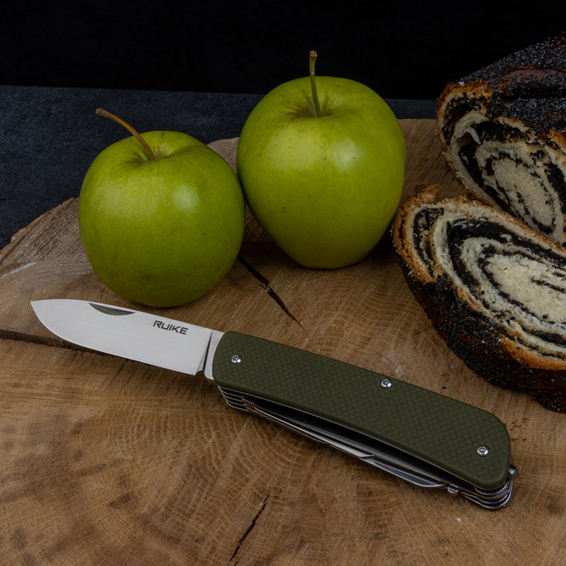Не менее важную функцию чем нож, играют и остальные инструменты, встроенные в Ruike L42. В нижней части рукоятки размещены пила по дереву, уменьшенные в размере ножницы, шило, две прямые отвертки (малая и средняя), стропорез, открывалку для бутылок, инструмент, зачищающий провода от изоляции. С обратной стороны рукоятки можно достать штопор. Еще два инструмента помещены со стороны торца – это стеклобой и небольшой кольцо для подвешивания к ножу темляка.