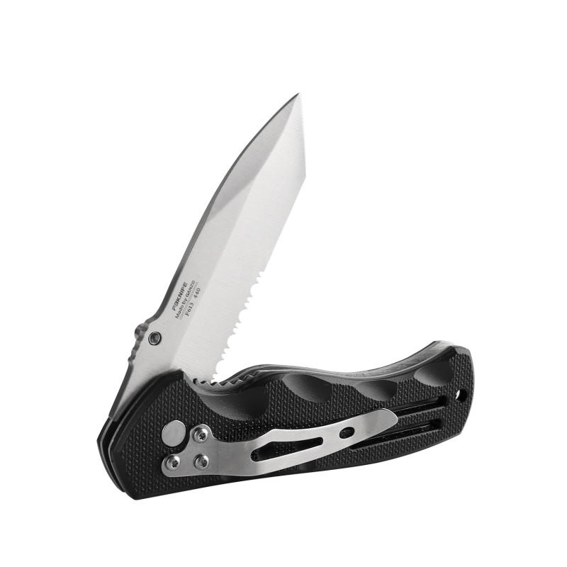 Firebird F613 — складной туристический нож со специфическим клинком и полусеррейторной заточкой. По типу клинок весьма приближен к танто — с резким срезом в направлении острия — обладает отличными колющими характеристиками. А благодаря смешанному типу заточки функционал инструмента заметно расширяется, так как для работы с некоторыми материалами серрейтор гораздо эффективнее, чем нож с прямой заточкой лезвия. Таким образом компания предлагает нам весьма оригинальную модель складного портативного ножа, который имеет на вооружении полусеррейторный клинок типа танто и управляется фиксатором Liner Lock. Firebird F613 можно рассматривать как инструмент для выживания, а также это практичный нож для охотника, рыбака или туриста.Удивительно легкий — всего 87г веса — Ganzo 613 в собранном виде достигает лишь 10.9 см в длину и прекрасно умещается в карманах, не говоря уж о поклаже. В рабочем состоянии длина ножа равна 18.3 см, а многофункциональное лезвие занимает 7.4 см от общего размера. Для клинка использовалась нержавеющая сталь марки 440 — вполне традиционный выбор большинства ножевых мастеров и производителей в силу высокой прочности и неприхотливости данного материала. Толщина клинка по обуху достигает 0.25 см.