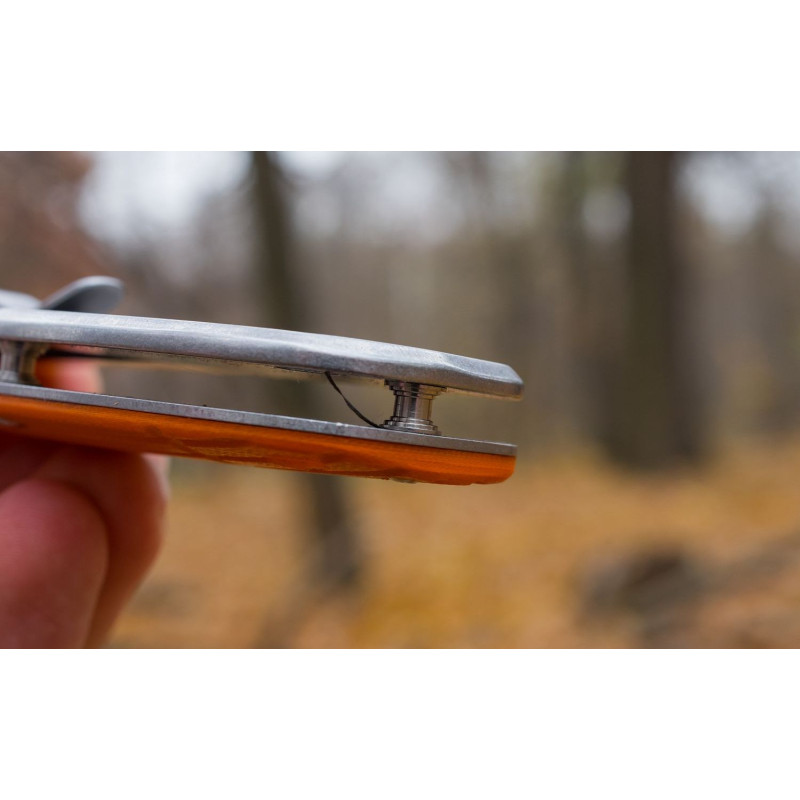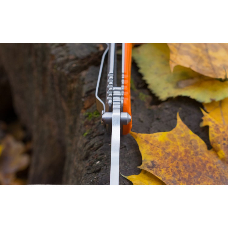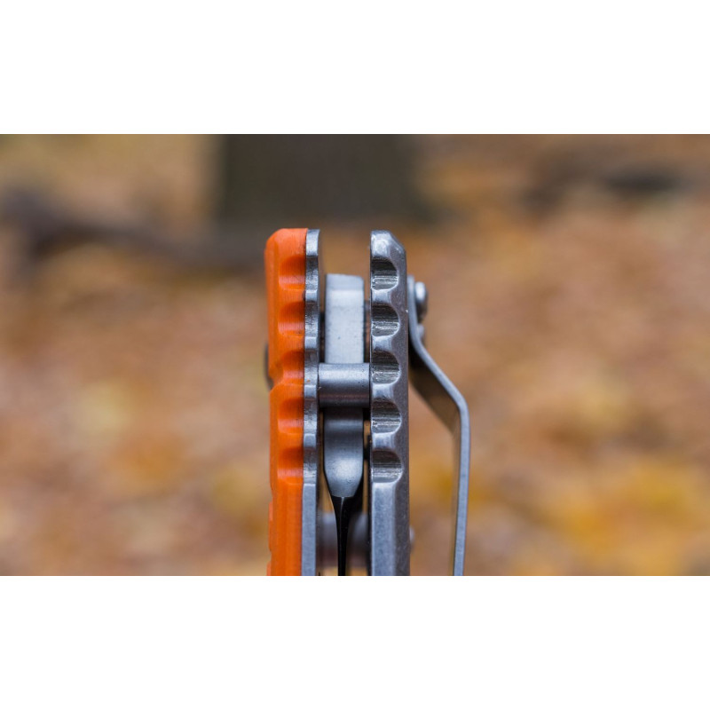 Щоб носити складений ніж було зручно і безпечно, виробники вибрали для нього популярний тип замку FrameLock. Він відомий високою надійністю і простотою використання. Виходячи з особливостей фіксуючого механізму, основою рукоятки ножа є металева пластина. Пластикова накладка прикрашає лицьову сторону ручки. Для неї використаний міцний склопластик G10, який відомий своєю зносостійкістю. Поверхня накладки — не рівна, що зроблено спеціально для більш міцного захоплення ножа. Також на рукоятці передбачені кліпса і отвір для темляка, щоб власник ножа міг закріпити його, наприклад, на лямці рюкзака.