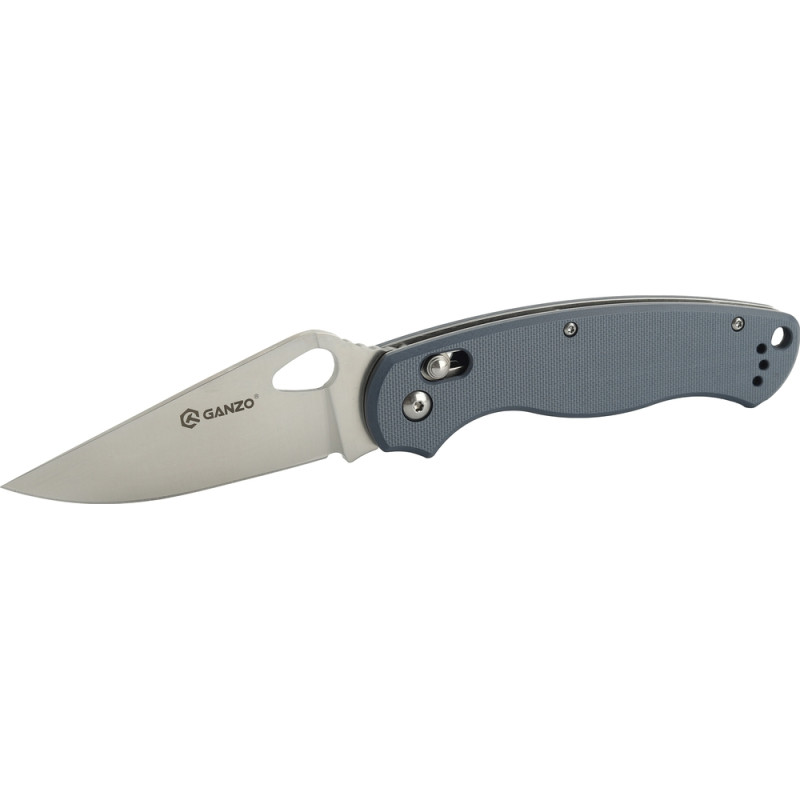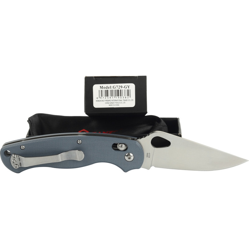 Модель Ганзо G729-GY відноситься до універсального типу складних ножів і, незважаючи на свій витончений дизайн, демонструє високу зносостійкість і надійність. Обриси клинка візуально нагадують ніж Spyderco. Він також має схожий отвір, яке призначене для упору під палець.