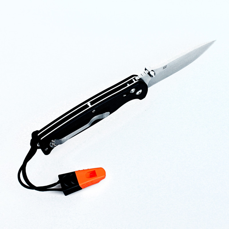Рукоятка клинка одночасно легка і міцна. Вона зроблена з пластику G10. Покупці можуть вибрати з трьох варіантів забарвлення: чорний, зеленої та помаранчевої. Стиль оформлення — єдиний. Це дві накладки з шорсткою поверхнею, прикручені до сталевій основі. На рукоятці розміщена притискна кліпса темляк-мотузочок, до якого приєднаний свисток.