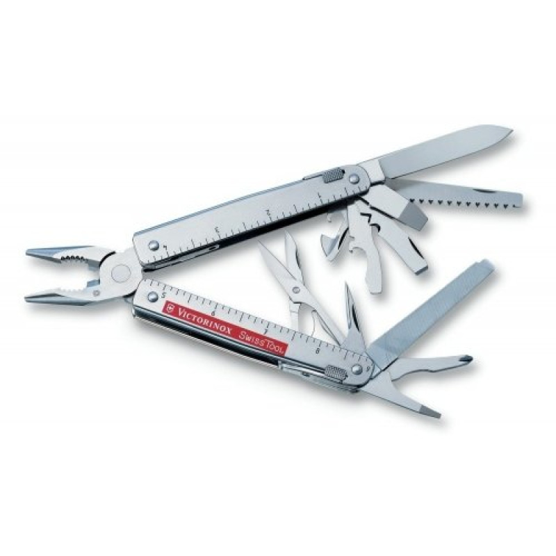 Унікальний багатофункціональний складаний ніж Victorinox Swisstool. Дана модель вразить оригінальним набором інструментів кожного чоловіка. Спеціальні електричні щипці, скребок для ізоляції та ексклюзивна лінійка розташована на обох ручках. Також даний ніж включає в себе пилу по дереву і спеціальний напилок з ножівкою по металу. Так що в будь-який підходящий для Вас момент Ви зможете розрізати дерево, підпиляти метал або зробити гладкий зріз напилком. А ось з наявними високоміцними плоскогубцями можна робити дуже багато корисних речей, наприклад, за рахунок спеціального інструменту можна з легкістю зняти ізоляцію, і зробити ідеальний опресування проводів. Що входить у набір інструментів стамеска стане незамінною річчю для будь-якого токаря. У щоденних цілях можна використовувати ножиці. А з викрутками, ви зможете загвинтити будь шуруп у важкодоступному для Вас місці, так як виготовлена в досить невеликих габаритних розмірах. Даний ніж вільно розміщується в портфелі, маленькій сумці або навіть в кишені і містить у собі викрутки і плоскогубці, відкривачки і кусачки, універсальне лезо і ножиці і багато інших корисних інструментів.