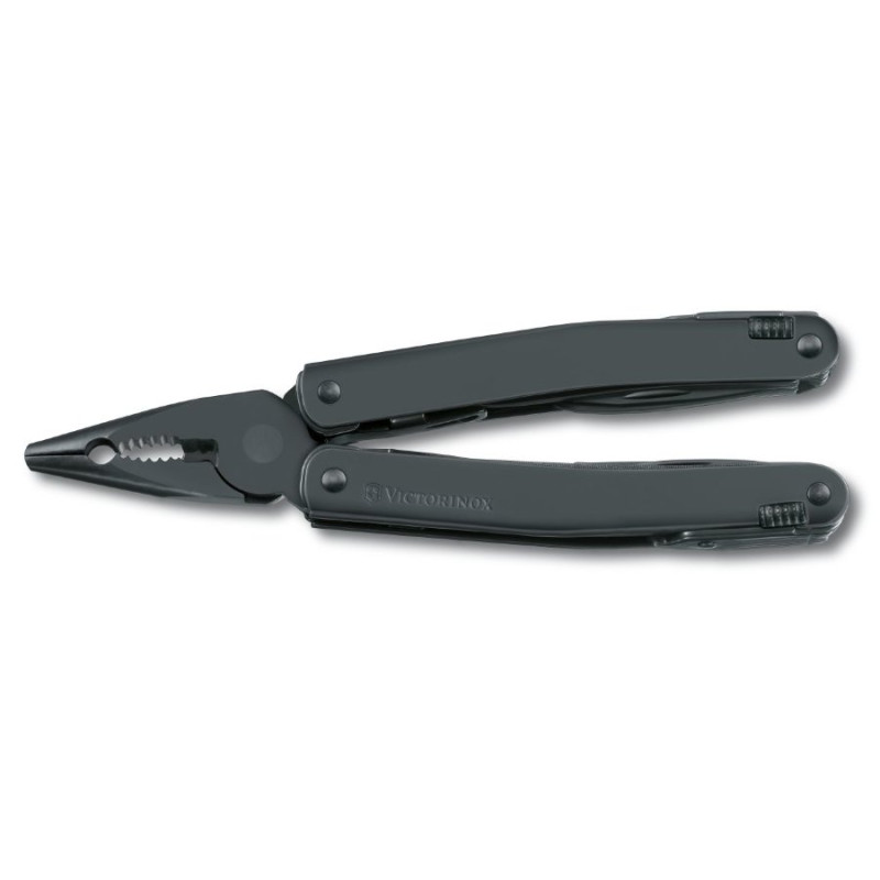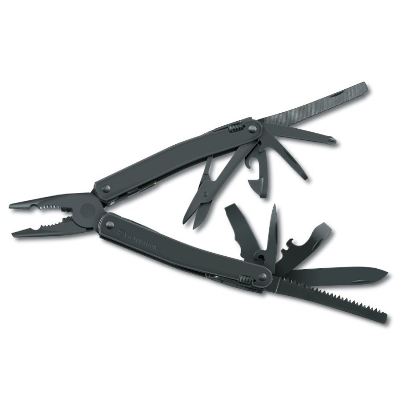 В компактну конструкцію виробу включені інструменти, призначені для особистої гігієни (пилочка для нігтів, скребок), а також безліч пристосувань побутового призначення (консервний ніж, хрестова викрутка, плоскогубці, шило, лінійки різних розмірів і т. д.). З появою Victorinox Swisstool поняття про можливу багатофункціональності складного ножа істотно розширилося. Представлена модель стане оптимальним рішенням для тих, кому раніше не вистачало деяких опцій в комплектації улюбленого портативного аксесуара. Зручність та легкість експлуатації, а також безпеку використання гарантується особливим механізмом, з вбудованим замком U-lock. Традиційним для швейцарського ножа Victorinox, матеріалом виготовлення виробу послужила нержавіюча сталь високої якості, стійка до широкого ряду руйнівних факторів, серед яких: негативний вплив вологи, згинання і деформація інструментів, внаслідок механічного впливу. Функціональна насиченість Викторинокс Свизтул гармонійно збалансована стриманим дизайном. Оформлення корпусу, як і самих окремих інструментів, представлено чорним матовим покриттям, яке, в силу застосування інноваційних технологій, відрізняється високою практичністю і зносостійкістю. Приємним сюрпризом для покупців представленої моделі ножі Victorinox стане наявність таких унікальних інструментів, як пила і напилок по металу, інструмент для зняття ізоляції, пристрій для перекушування твердої дроту, щипці для виконання робіт з електричними проводами. Для багатьох користувачів ці інструменти можуть виявитися справжньою знахідкою! Багатофункціональний інструмент володіє особливим типом клинка – Drop Point. Ножі такого роду широко затребувані серед людей, що активно займаються туризмом. Мультитул Victorinox Swisstool важить всього 208 гр. і не вимагає багато місця для зберігання.