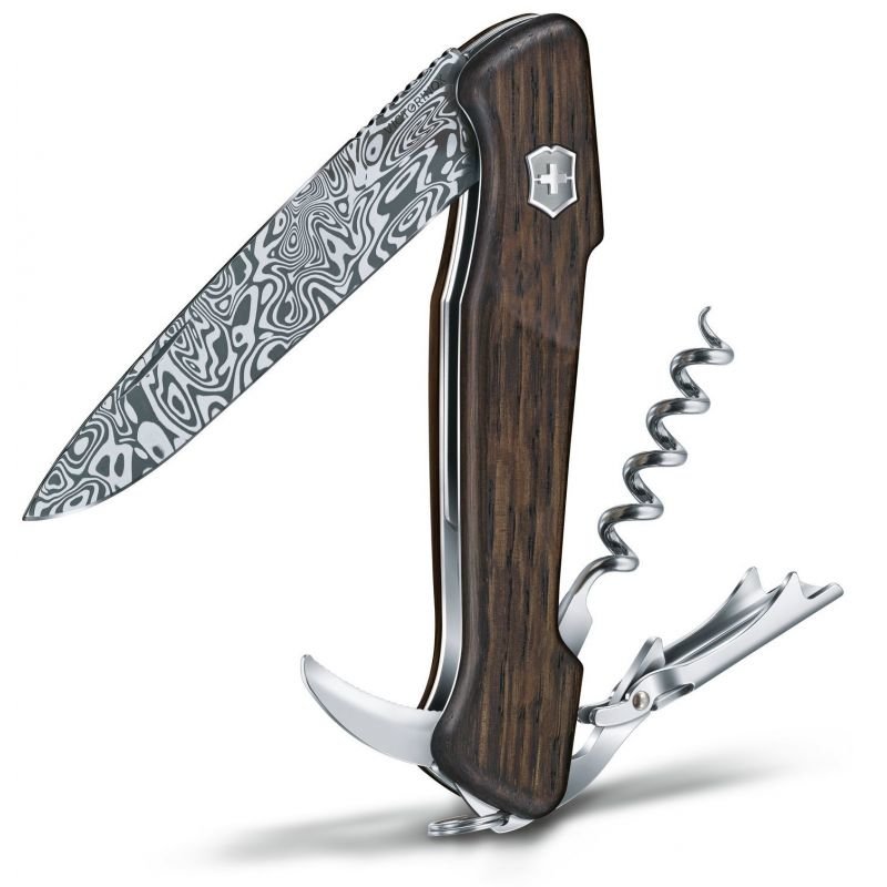 Великий швейцарський ніж WINE MASTER Damast з блокуванням леза Liner lock /130мм/1 шар/6 функцій/клинок з дамаської сталі/дубові накладки/штопор + чохол (Lim.Ed.6000)