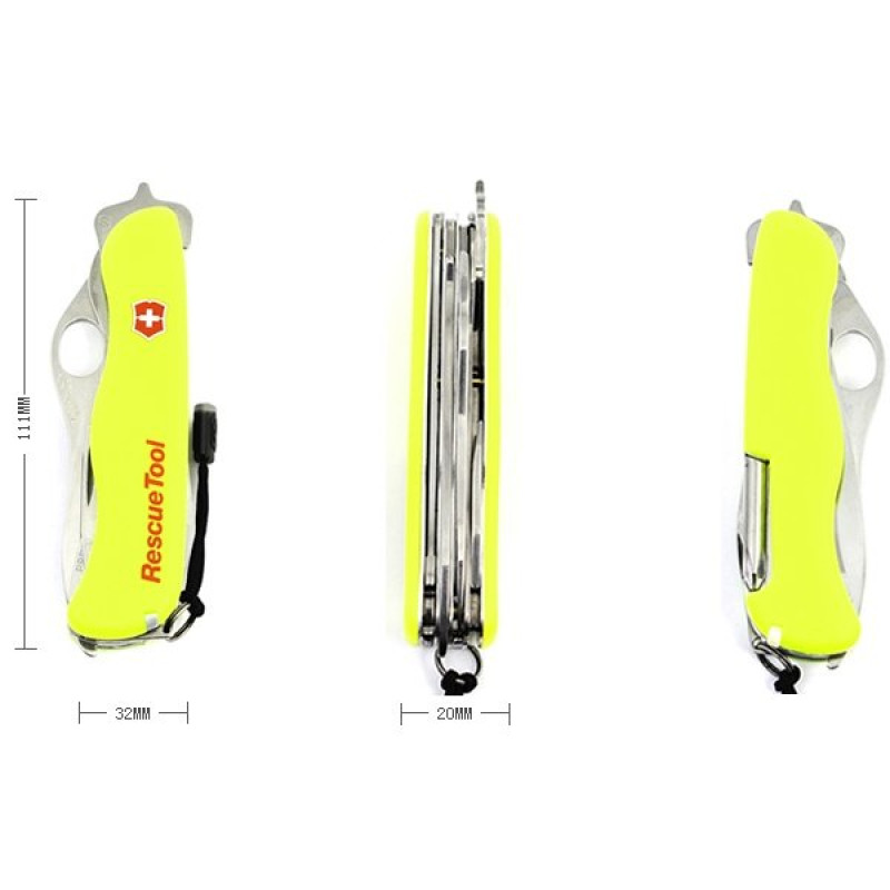 Швейцарський кишеньковий армійський ніж Victorinox Rescue Tool з фіксатором був розроблений спеціально для співробітників швидкої допомоги та МНС. Ключовим у ножі є блискавична здатність відкриватися і бути готовим до роботи. Лезо фіксується у відкритому положенні замком типу лайнер-лок, а накладки на рукояті виключають ковзання в руці . Крім того, ніж Victorinox дуже практичний і містить всі основні інструменти для повсякденного життя. Ніж виготовлений з високоякісної нержавіючої сталі. Рукоять виконана з жовтого матового нейлону. Розмір – 113x31.5x18 мм. Вага – 240 г..