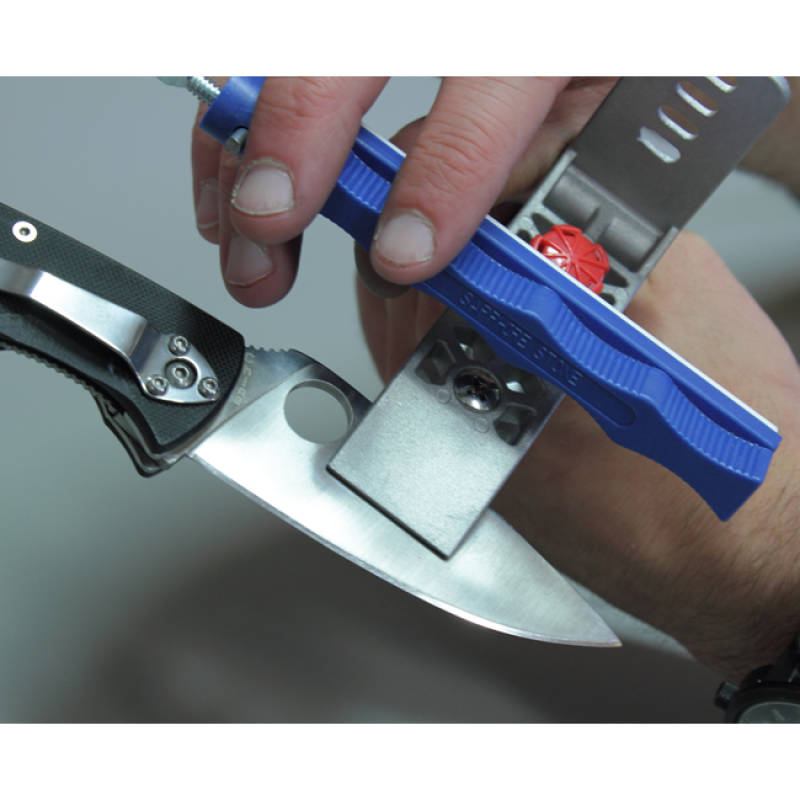 Камінь Lansky Super Saphire: призначений для фінальної полірування ріжучої кромки. Пластиковий корпус держателя червоного кольору забезпечений зручними рифленими подпальцевыми виїмками для надійного утримання каменю під час заточування ножа. Корпус держателя також оснащений кріпленням з болтом для направляючої, для використання точильного каменя у складі точильной системи серії Lansky Knife Sharpening System. При роботі можна використовувати як самостійний інструмент, так і з нанесенням полірувальних паст.