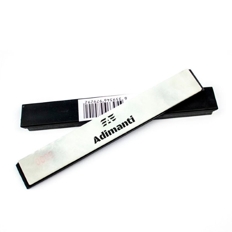 Камінь для заточування Аdimanti 8000 зроблений з натурального природного матеріалу, що вже говорить про його високу якість. Він щільний і гладкий, добре шліфує попередньо заточені інструменти. Точильні камені з великою гритностью використовуються як для роботи з ножами, так і для інших інструментів, ріжуча кромка яких вимагає бритвеної заточування. Завдяки тому, що лезо стає після шліфування максимально гладким, заточка тримається довше, ніж без цієї процедури. Аdimanti 8000 підходить для роботи зі сталлю високої твердості. Використовувати цей точильний камінь можна як в комплекті з ручними точильными верстатами, так і самостійно. Розміри каменю становлять 22х157 мм. Він розміщений на тонкому підставі з чорного пластику.