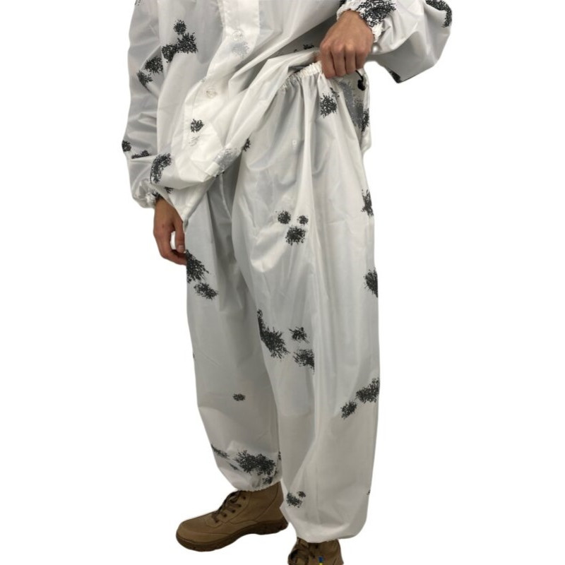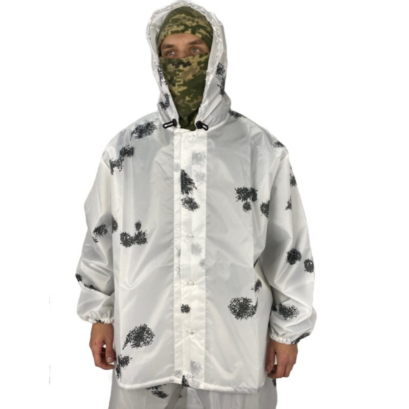Маскировочный костюм "Клякса" - брюки и куртка.Ветро- и влагозащитный. Для использования в заснеженной местности.Глубокий капюшон на затяжке по периметру и сзади для удобного использования даже в шлеме. застегивается на пуговицы.Манжеты на рукавах и брюках.Свободный крой для удобного использования на одежде.Материал : ткань Оксфорд 130 г/м2;Цвет : белый, черный;Размер: XXXL.
