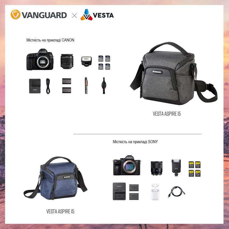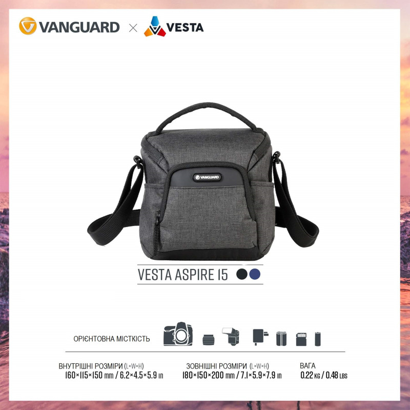 Когда Вы готовы перейти от снимков в смартфоне к настоящей фотографии, сумки Vanguard Vesta Aspire - это именно то что Вам необходимо, конечно же, наряду с самой фотокамерой. Vesta Aspire 15 воплощает концепцию "минимум для максимума". Это идеальная суперкомпактная и стильная наплечная сумка для цифровой зеркальной камеры со штатным объективом, позволяющая дополнительно разместить внутри фотовспышку, а также множество необходимых аксессуаров, и даже настольный штатив Vanguard Vesta TT1. Разработанная для самых популярных комплектов камер, Vesta Aspire обеспечивает отличную защиту от ударов и влаги, а также функциональность наряду с интуитивно понятной компоновкой карманов и отделений.