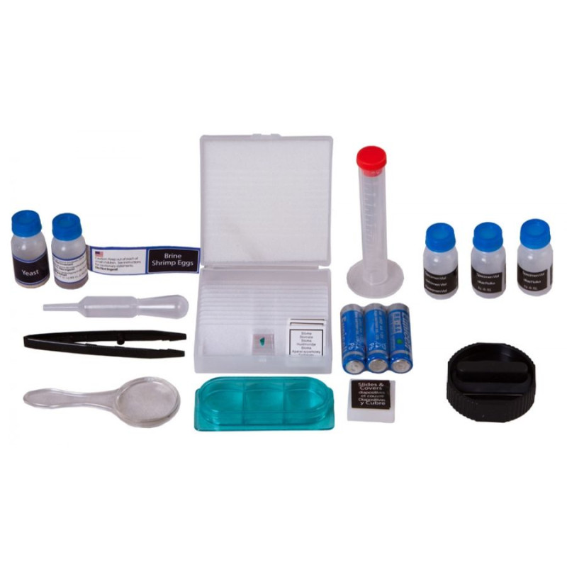 Комплектация Микроскоп : пластиковый корпус Объективы : 3 шт. Зум-окуляр : 1 шт Инкубаторий : 1 шт Слайды : 3 шт. Предметные стекла : 8 шт Покрывные стёкла: 8 шт. Набор аксессуаров для препарирования Колбы для образцов : 5 шт