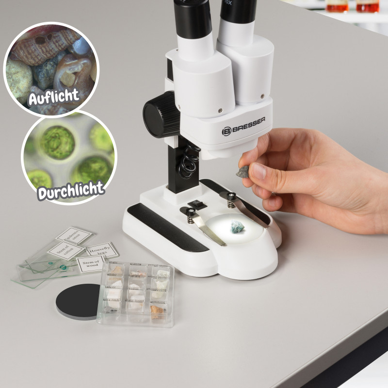 Микроскоп Bresser Junior Stereo 20х-50x - один из лучших микроскопов для детского развития, который позволяет наблюдать действительные детали микромира. Основное его преимущество в том, что его можно использовать и как стереоскопический микроскоп, и частично как биологический. Изначально эта модель предназначена для получения стереоскопического изображения в отраженном свете при небольших увеличениях объемных предметов, таких как монеты, микросхемы, насекомые, минералы и др. Однако благодаря наличию подсветки проходящим светом и окуляров с увеличением 25 крат, данный микроскоп позволит наблюдать структуру тканей растений, планктон и мельчайшие детали строения насекомых. Кроме того в комплекте поставляются уже подготовленные слайды с тонкими срезами растений и насекомых, а также набор из двенадцати минералов.