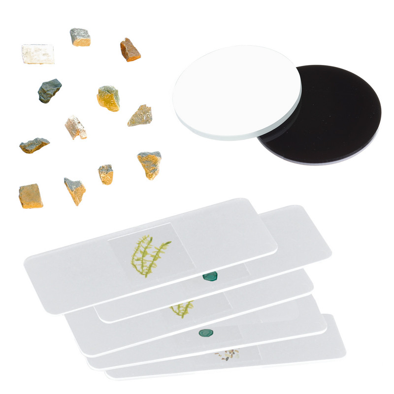 Стоит отметить, что для начала наблюдений не требуется никаких дополнительных затрат, поскольку в комплектацию уже добавлены подготовленные слайды с тонкими срезами растений и насекомых, а также набор из двенадцати различных минералов.