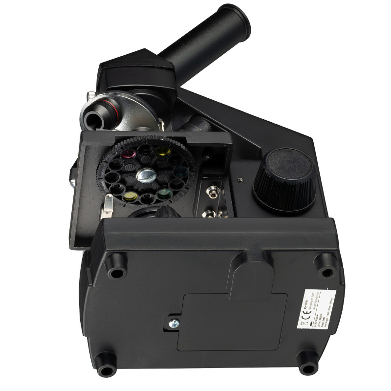 Комбинация двух широкоугольных окуляров и трёх объективов даёт возможность получить увеличение 640х. Удачным решением является использование в детском микроскопе линзы Барлоу для получения бесступенчатого (плавного) зуммирования изображения, благодаря чему достигается максимальное увеличение 1024х. Монокулярная насадка, наклонённая под углом 45°, поворачивается на 360°, позволяя наблюдать в любом удобном положении, а также работать с микроскопом группе детей или взрослых без перемещения микроскопа в пространстве. Светодиоды обеспечивают подсветку препарата проходящим и отраженным светом. Проходящий свет используется для наблюдения прозрачных объектов, отражающий - для непрозрачных трёхмерных. Использование двух ламп одновременно может быть полезно при наблюдении полупрозрачных образцов. Яркость освещения, цветопередача и направленность пучка света контролируется диафрагмой с различными диаметрами отверстий и пятью светофильтрами. Дополнительные возможности предоставляет PC-микроокуляр, поставляемый в комплекте с программным обеспечением. С их помощью можно наблюдать на мониторе персонального компьютера всё, что происходит под объективом микроскопа в реальном времени, а также можно создавать и редактировать фотографии с разрешением 640х480 в формате JPEG и снимать видеоролики в формате 320х240. Системные требования: процессор с тактовой частотой 2 GHz; операционная система Windows XP SP3, Vista, 7, 8, 1024 MB RAM, и 4 Gb места на жестком диске. Питание микроскопа осуществляется от трех самых распространённых батарей АА (LR6). Таким образом микроскоп независим от сети переменного тока и может быть использован даже в полевых условиях. Перечень аксессуаров включает готовые слайды, к осмотру которых можно приступить немедленно. Также в наборе есть аксессуары для препарирования образцов, микротом для самостоятельного приготовления образцов, инкубаторий и готовые препараты. Не смотря на то, что данный прибор скорее будет интересен для детей и подростков, все оптические элементы выполнены из стекла, серьёзное увеличение позволит рассмотреть практически всё, что доступно взрослому биологическому микроскопу. Оптические характеристики:- Увеличение : от 40х до 1024х