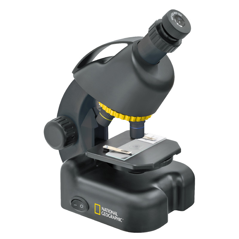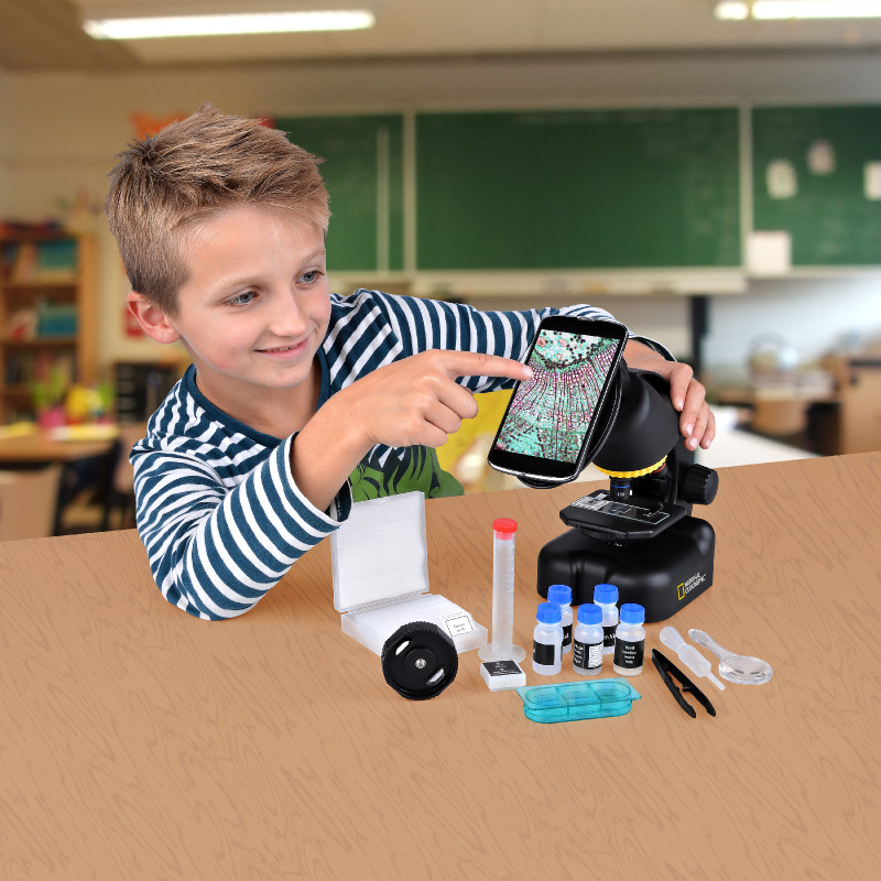 National Geographic 40x-640x (с адаптером для смартфона) являет собой современный микроскоп для детского развития. Микроскоп укомплектован большим количеством различных аксессуаров, готовых слайдов для просмотра, оснащен револьверной головкой с тремя объективами, дающими в комплексе с зум-окуляром увеличение до 640х. Отличительной особенностью данного микроскопа является наличие адаптер для камеры смартфона. С помощью адаптера для смартфона, идущего в комплекте с микроскопом, легко фотографировать объекты наблюдений на камеру вашего смартфона.