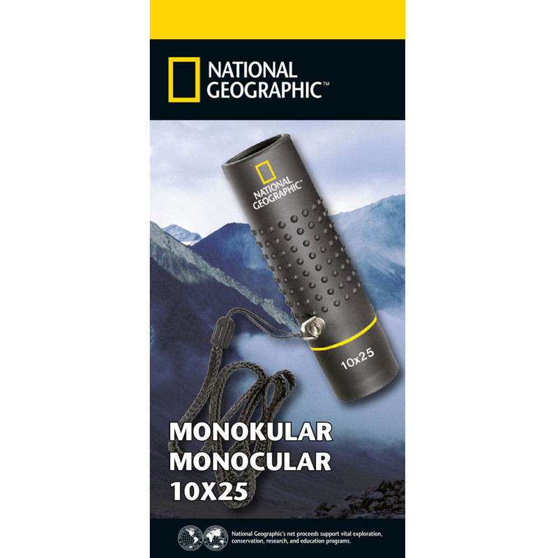 National Geographic 10x25 - доступный по цене монокуляр с оптимальным сочетанием диаметра объектива, увеличения и габаритов. Предельно простой в использовании оптический прибор на каждый день, который всегда может находиться под рукой, будь то карман рюкзака или бардачок автомобиля.