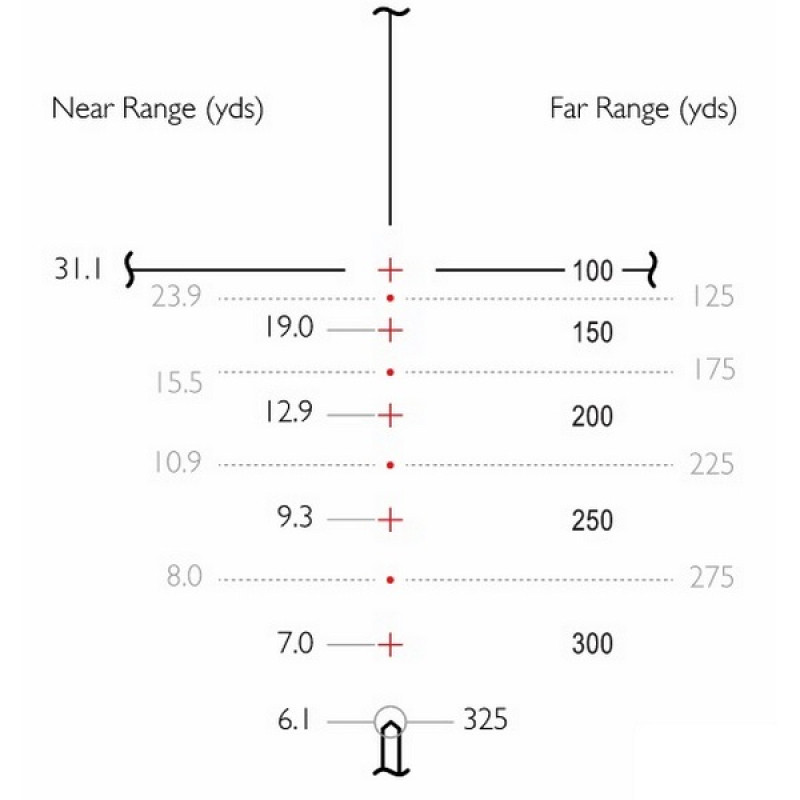 Rimfire .22 WMR - специальная сетка, разработанная компанией Hawke Optics для спортивной стрельбы и охоты на мелкую дичь. Сетка максимально точно специализирована под винтовки для стрельбы патронами кольцевого воспламенения .22 WMR (Калибр 5,7) с начальной скоростью полета пули 610 м/с, с высотой установки прицела 45 мм. Сетка имеет перекрестие типа Duplex со специальной разметкой, благодаря которой можно вести прицельную стрельбу с шагом в 25 ярдов. Единожды пристреляв прицел на расстояние 100 ярдов, с помощью данной прицельной сетки можно легко определять траекторию пули на расстоянии до 325 ярдов, что даже превышает эффективную дальность стрельбы патрона .22 WMR. Параметры данной сетки верны при максимальном увеличении 12х. Данная прицельная сетка чрезвычайно проста и удобна и может использоваться с успехом также для стрельбы из пневматического оружия. Персональную адаптацию сетки под конкретное оружие и тип снаряда позволит совершить бесплатный баллистический калькулятор X-ACT