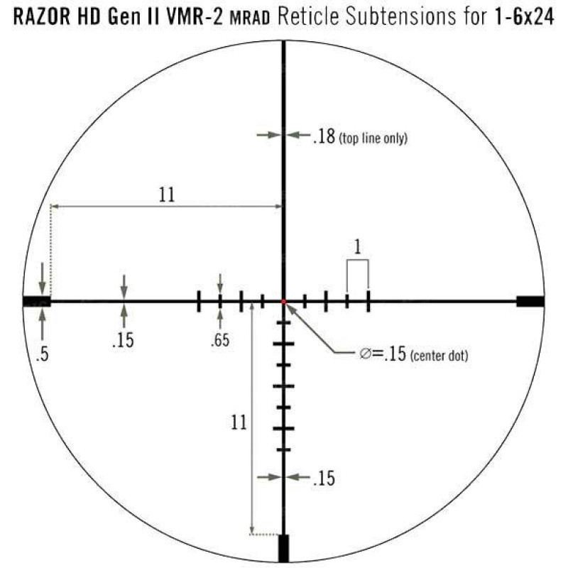 Оптический прицел Vortex Razor Gen II-E HD 1-6x24 обеспечивает высочайший уровень четкости, разрешения и точности цветопередачи. Окуляр с оптимальным удалением выходного зрачка для стрелка позволяет осуществлять мгновенный поиск и наведение на цель, допуская прицеливание двумя глазами. Ультра-гладкая трубка прицела имеет диаметр 30 мм, выполнена из авиационного алюминия. Барабанчики ввода поправок низкопрофильные и имеют защитные крышки. Сбрасываемые в ноль барабанчики позволяют ввести поправку 20 MRAD за один оборот. Сетка VMR-2 имеет хорошо различимые короткие и длинные маркеры. Знание градации маркеров и расстояние между ними в MRAD, прицельная сетка помогает определить дистанцию до цели, вносить боковые и вертикальные поправки. Подсветка центральной точки дает прицелу функциональность коллиматорного прицела и преимущества при стрельбе навскидку. Барабанчик подсветки расположен с левой стороны прицела и имеет 11 настроек яркости.