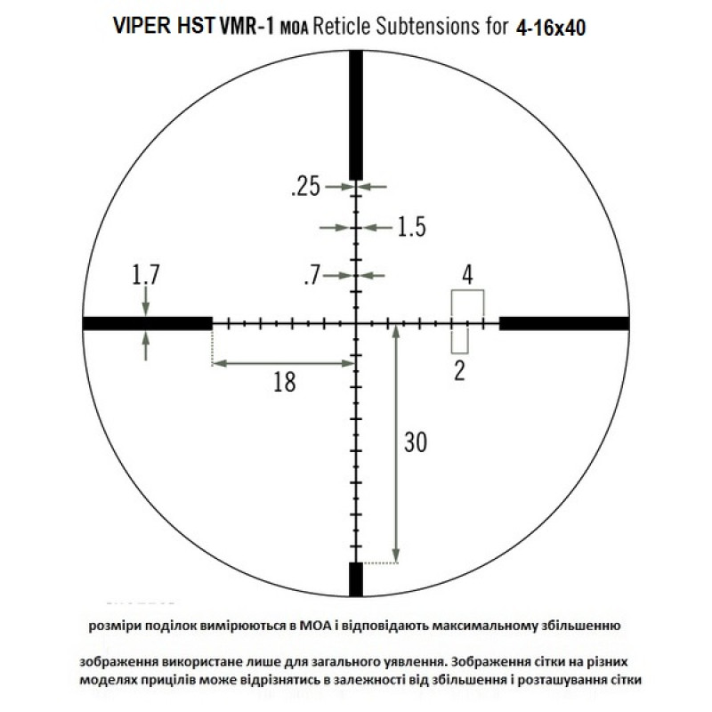 Не зависимо метода охоты и типа выбранного оружия, прицелы Vortex Viper HST всегда будут на высоте и помогут направить выпущенный снаряд точно в цель. Эта модель (HST = Hunters, Shooters and Tactical) объеденила лучшие достоинства популярных серий прицелов Viper HS и Viper PST, и может использоваться как для стрельбы из высокоточных пневматических винтовок, так и для различных типов нарезного оружия. Не зависимо от модели, каждый прицел Vortex Viper HST имеет расширенный диапазон увеличений 4х Zoom, что означает четырехкратную разницу между минимальным и максимальным уровнем увеличения. Трансфокатор и барабан ввода вертикальных поправок снабжены опто-волоконными указателем, помогающими безошибочно установить необходимую кратность и внести точно поправки даже в темноте. Высокое качество оптики обеспечивают низкодисперсные XD-стекла объектива и фирменное просветляющее покрытие XR. Всестороннюю защиту от влаги, запотевания, механических воздействий и мощной отдачи обеспечивает герметизация уплотнительными кольцами, заполнение инертным аргоном, защитное покрытие линз ArmoTek и монолитный 30-мм корпус из авиационного алюминия. Дальномерная прицельная сетка VMR-1, открытые тактические барабаны и механизм отстройки параллакса позволяют быстро вносить все необходимые корректировки по ходу стрельбы и точно определить траекторию падения пули. Прицел имеет продвинутую патентованую систему обнуления барабанов CRS Zero Stop. Не остается сомнений, что, Vortex Viper HST 4-16x44 (VMR-1 MOA) - один из лучших прицелов для высокоточной стрельбы на средние и дальние дистанции, который станет неотъемлемой составляющей успеха при каждом выстреле в цель.
