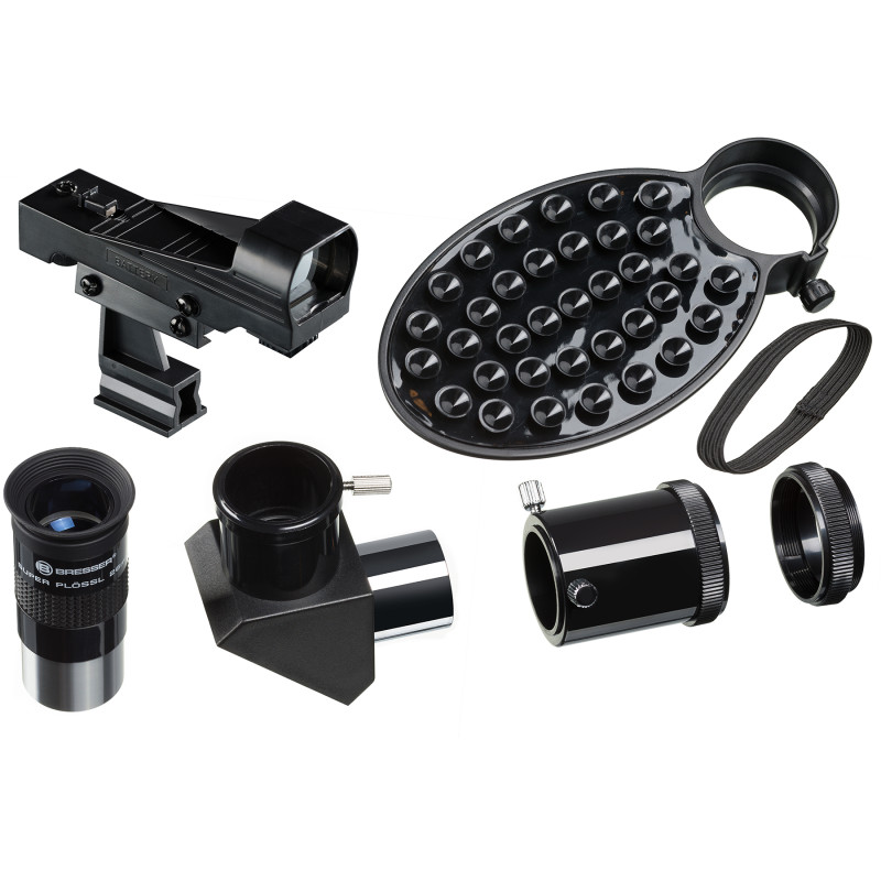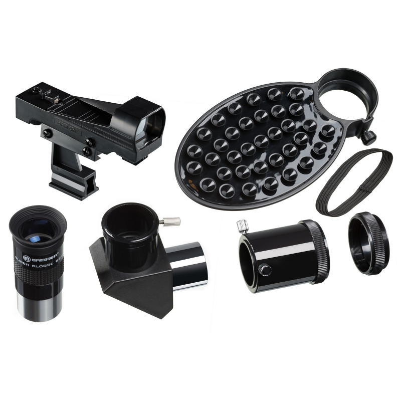 Телескоп может с успехом использоваться для астрофотографии, для чего в комплекте поставляется и T2-кольцо для присоединения SLR-камеры, и адаптер для камеры смартфона (планшета). T2-кольцо накручивается вместо держателя окуляра, а адаптер для смартфона крепится на выбранном окуляре и позволяет проводить фото и видеосъемку основной либо фронтальной камерой гаджета. Гладкая тыльная сторона смартфона надежно крепится с помощью множества присосок адаптера (в случае рифленой тыльной поверхности смартфона рекомендуется использовать фронтальную камеру). Набор аксессуаров облегчит наблюдения и сделает их более увлекательными и подробными. В комплектацию кроме адаптера для камеры смартфона (планшета), входят два окуляра, поворотная карта звездного неба и программное обеспечение.