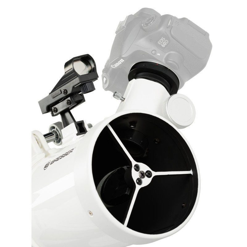 Комплектація Рефлектор/дзеркальний телескоп<br />Кріплення для телескопа Азімут НАНО<br />Штатив із нержавіючої сталі з лотком для аксесуарів<br />Окуляр: BRESSER Super Plössl 26 мм 1,25 дюйми (31,7 мм)<br />Світлодіодний шукач із червоною точкою<br />Сонцезахисний фільтр об'єктива<br />Адаптер камери смартфона<br />Перехідне кільце камери T2 (M42x0,75 мм)<br />Програмне забезпечення та зіркова карта, що обертається