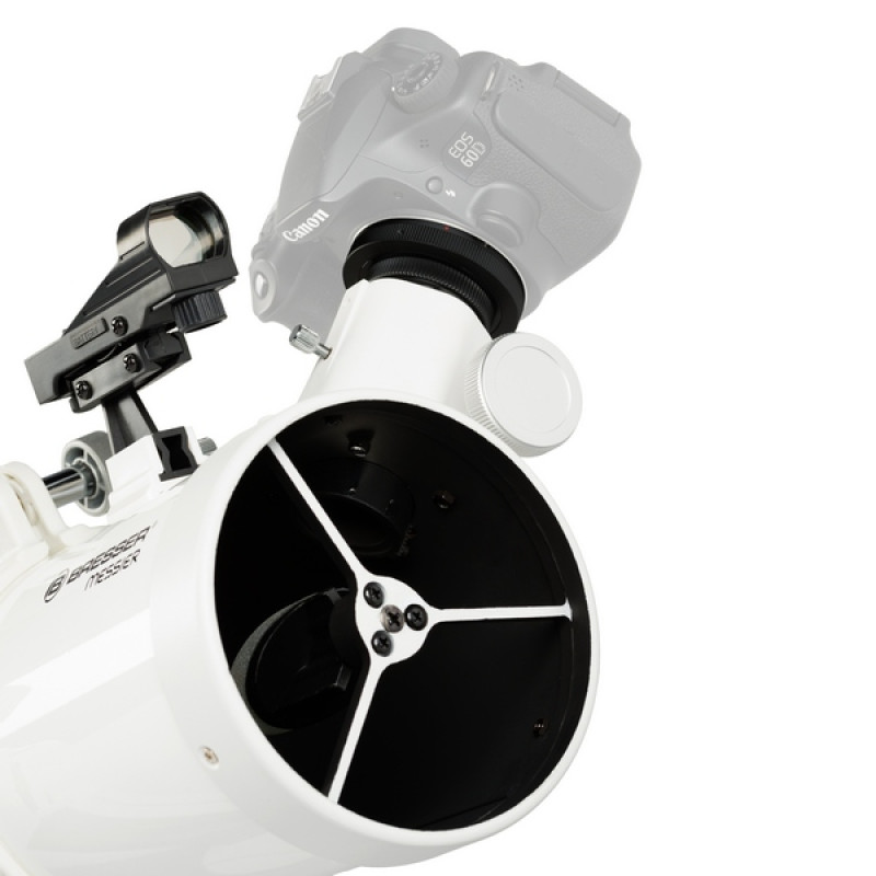 Телескоп может с успехом использоваться для астрофотографии, для чего в комплекте поставляется и T2-кольцо для присоединения SLR-камеры, и адаптер для камеры смартфона (планшета). T2-кольцо накручивается вместо держателя окуляра, а адаптер для смартфона крепится на выбранном окуляре и позволяет проводить фото и видеосъемку основной либо фронтальной камерой гаджета. Гладкая тыльная сторона смартфона надежно крепится с помощью множества присосок адаптера (в случае рифленой тыльной поверхности смартфона рекомендуется использовать фронтальную камеру). Набор аксессуаров облегчит наблюдения и сделает их более увлекательными и подробными. В комплектацию кроме адаптера для камеры смартфона (планшета), входят два окуляра, поворотная карта звездного неба и программное обеспечение.