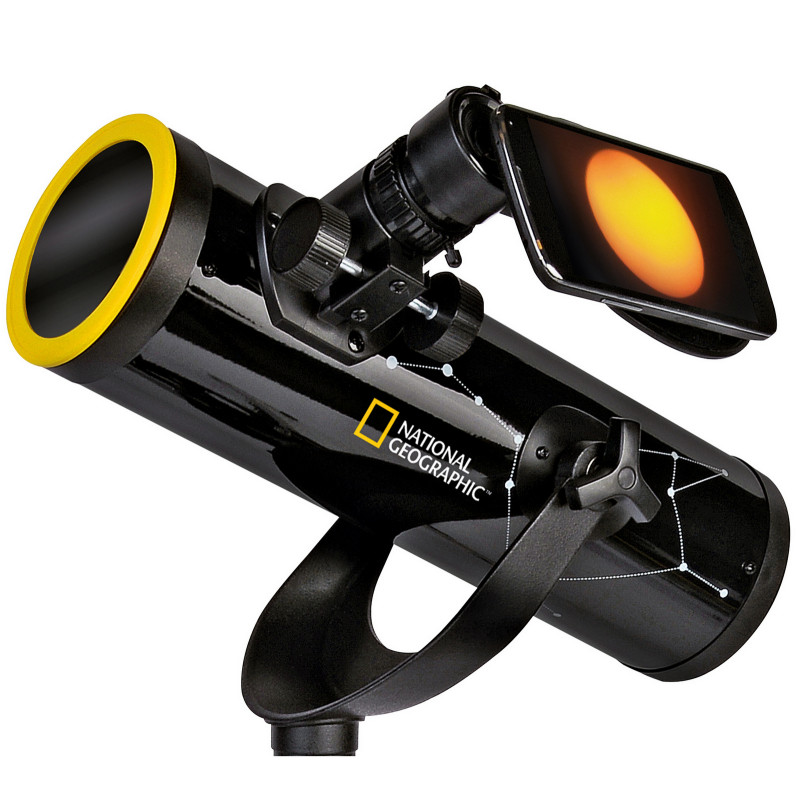 Универсальный и уникальный в своем роде телескоп National Geographic 76/350 AZ Solar ломает стереотип того, что захватывающие наблюдения в телескоп можно проводить только ночью. Теперь наблюдения за солнечной активностью, дневные ландшафтные наблюдения и ночные наблюдения звездного неба можно проводить с помощью одного телескопа National Geographic 76/350 AZ Solar. Важным моментом является наличие сертифицированного солнечного фильтра, позволяющего безопасно для глаз наблюдать за Солнцем. Дневные и ночные наблюдения можно заснять на камеру смартфона, для чего в комплекте с телескопом поставляется специальный адаптер. Данная модель имеет большую вариативность увеличений благодаря наличию линзы Барлоу в базовой комплектации.